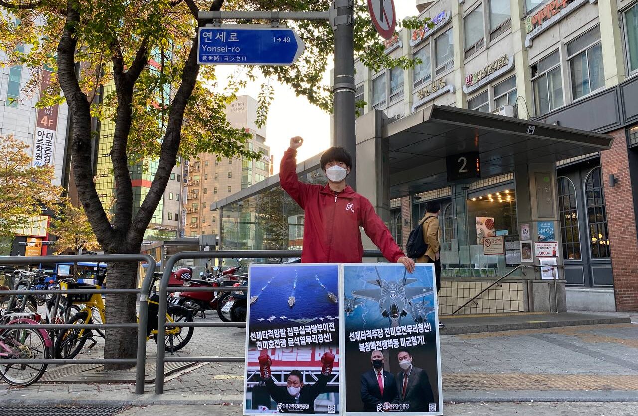 민중민주당학생당원은 <선제타격 망발하는 호전광윤석열 청산하자!>, <집무실국방부이전 윤석열호전무리 청산하자!>, <친미매국호전무리 국민의힘 당장 해체하라!>, <북침핵전쟁연습 중단하고 핵전쟁화근 미군 철거하라!> 구호를 힘차게 외쳤다.