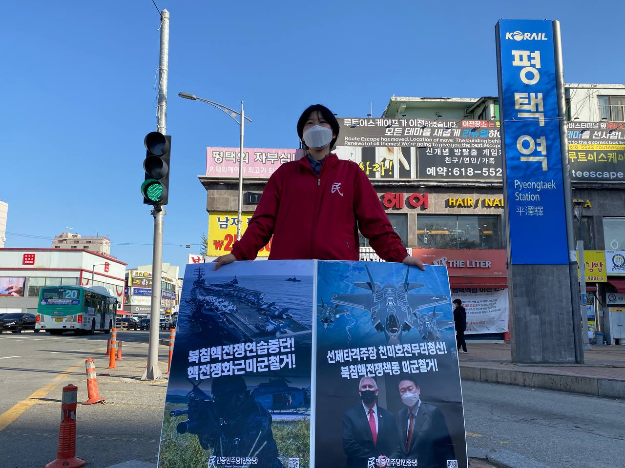 민중민주당학생당원은 <점령군으로 이땅을 강점한 미군은 평택주민들의 터전을 빼앗아 여의도의 5배면적이나 되는 평택 캠프험프리스를 구축했다. 미국은 미군기지건설비용의 92%이상을 우리정부에게 부담시켰고 민중복지에 쓰여야 할 우리의 혈세를 <미군유지비>라는 명목으로 가져가 미군기지내에 초호화아파트를 건설하는데 쏟아부었다. 미군이 방탕한 생활을 하며 배불리 잘살고 있을 때, 신문에는 생활고를 견디지 못해 일가족이 자살했다는 기사가 실린다.>고 목소리를 높였다.