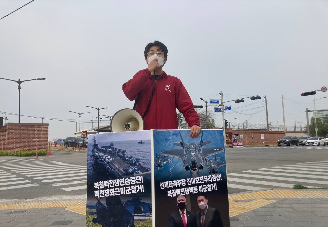 18일 민중민주당(민중당)은 평택미군기지캠프험프리스앞에서 <북침핵전쟁연습중단! 선제타격윤석열무리청산! 전쟁화근미군철거!> 정당연설회를 진행했다.