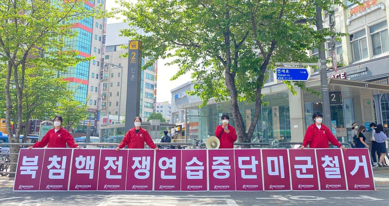 이어 <북침핵전쟁연습중단 미군철거> 구호피시를 펼치고 정당연설회를 진행했다.