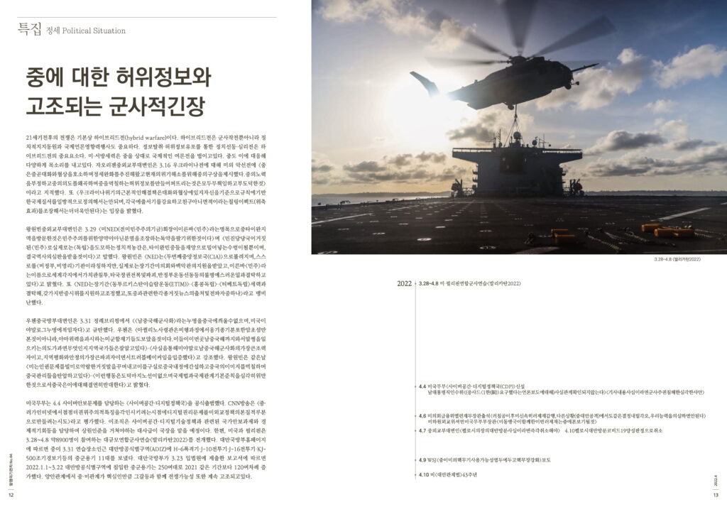 미국무부는 4.4 사이버안보문제를 담당하는 <사이버공간·디지털정책국>을 공식출범했다. CNN방송은 <중·러가인터넷에서점점더권위주의적특징을각인시키려는시점에디지털권리문제를미외교정책의본질적부분으로만들려는시도>라고 평가했다. 이조직은 사이버공간·디지털기술정책과 관련된 국가안보과제와 경제적기회등을 담당하며 상원인준을 거쳐야하는 대사급이 국장을 맡을 예정이다. 한편, 미국과 필리핀은 3.28~4.8 약8900명이 참여하는 대규모연합군사연습<발리카탄2022>를 전개했다. 대만국방부홈페이지에 따르면 중이 3.31 연습장소인근 대만방공식별구역(ADIZ)에 H-6폭격기·J-10전투기·J-16전투기·KJ-500조기경보기등의 중군용기 11대를 보냈다. 대만국방부가 3.23 입법원에 제출한 보고서에 따르면 2022.1.1~3.22 대만방공식별구역에 침입한 중군용기는 250여대로 2021 같은 기간보다 120여차례 증가했다. 양안관계에서 중·미관계가 핵심인만큼 그갈등과 함께 전쟁가능성 또한 계속 고조되고있다.