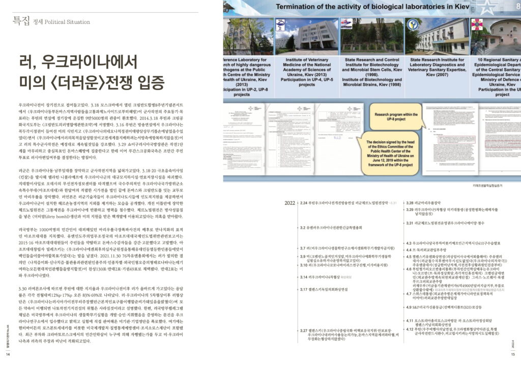 3.30 러여론조사에 따르면 푸틴에 대한 지지율과 우크라이나전이후 러가 올바르게 가고있다는 응답률은 각각 전월대비12%p·17%p 오른 83%·69%로 나타났다. 러·우크라이나의 5차협상이후 러협상단은 <우크라이나는러시아가이전부터주장했던근본적인요구를이행할준비가돼있음을밝혔다>며 모든 약속이 이행되면 나토작전기지건설의 위협은 사라질것이라고 설명했다. 한편, 러국방부텔레그램채널은 미국방부에서 우크라이나의 생물학무기실험을 개발·승인·지휘했음을 증명하는 문건을 우크라이나연구소에서 입수했다고 밝히고 실험에 직접 관여해온 미기관·기업명단을 폭로했다. 여기에는 헌터바이든의 로즈몬트세네카를 비롯한 미국제개발처·질병통제예방센터·조지소로스재단이 포함됐다. 최근 부차와 크라마토르스크에서의 민간인학살이 누구에 의해 자행됐는가를 두고 미·우크라이나측과 러측의 주장과 비난이 격화되고있다.