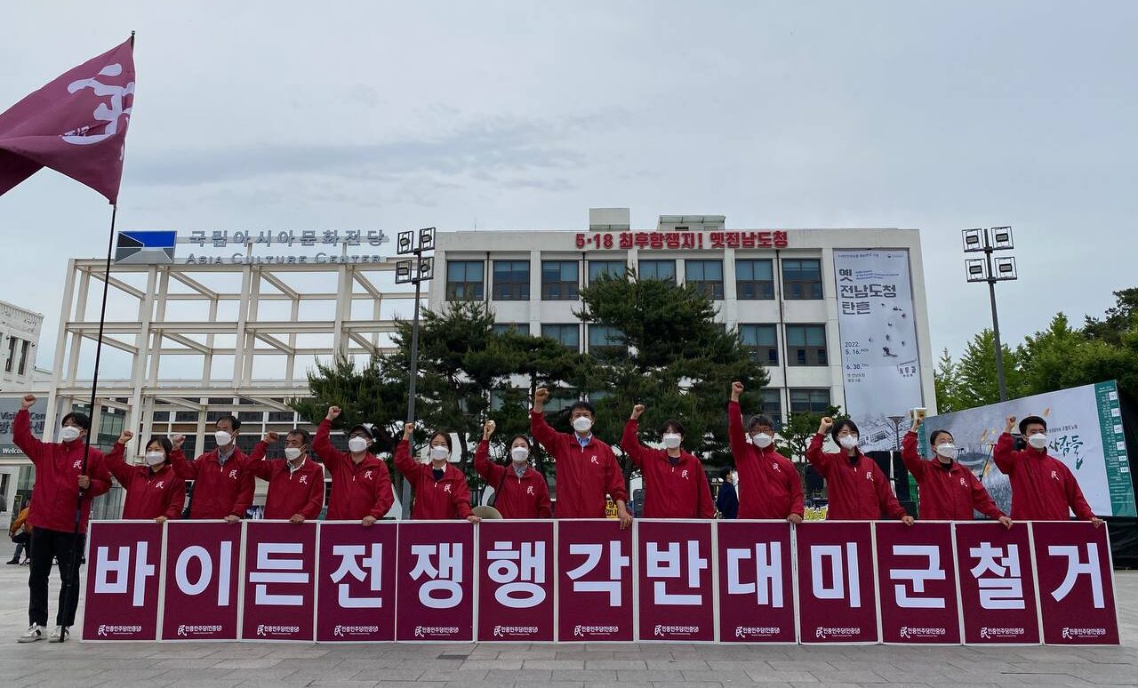 계속해서 <바이든이 코리아반도에 발을 들이며 전쟁행각을 벌이고 윤석열은 같은 민족을 향해 선제타격을 떠들어대고 있다. 광주항쟁정신을 계승한 우리들은 반드시 미군을 철거시키고 윤석열무리를 청산할 것이다.>라며 <광주에서 전국도처에서 민족자주와 민중민주를 외치며 투쟁하는 민중민주당은 우리민중과 함께 전진하며 억압과 착취, 전쟁과 학살이 없는 평화로운 새세상을 건설할 것이다.>라고 밝혔다.