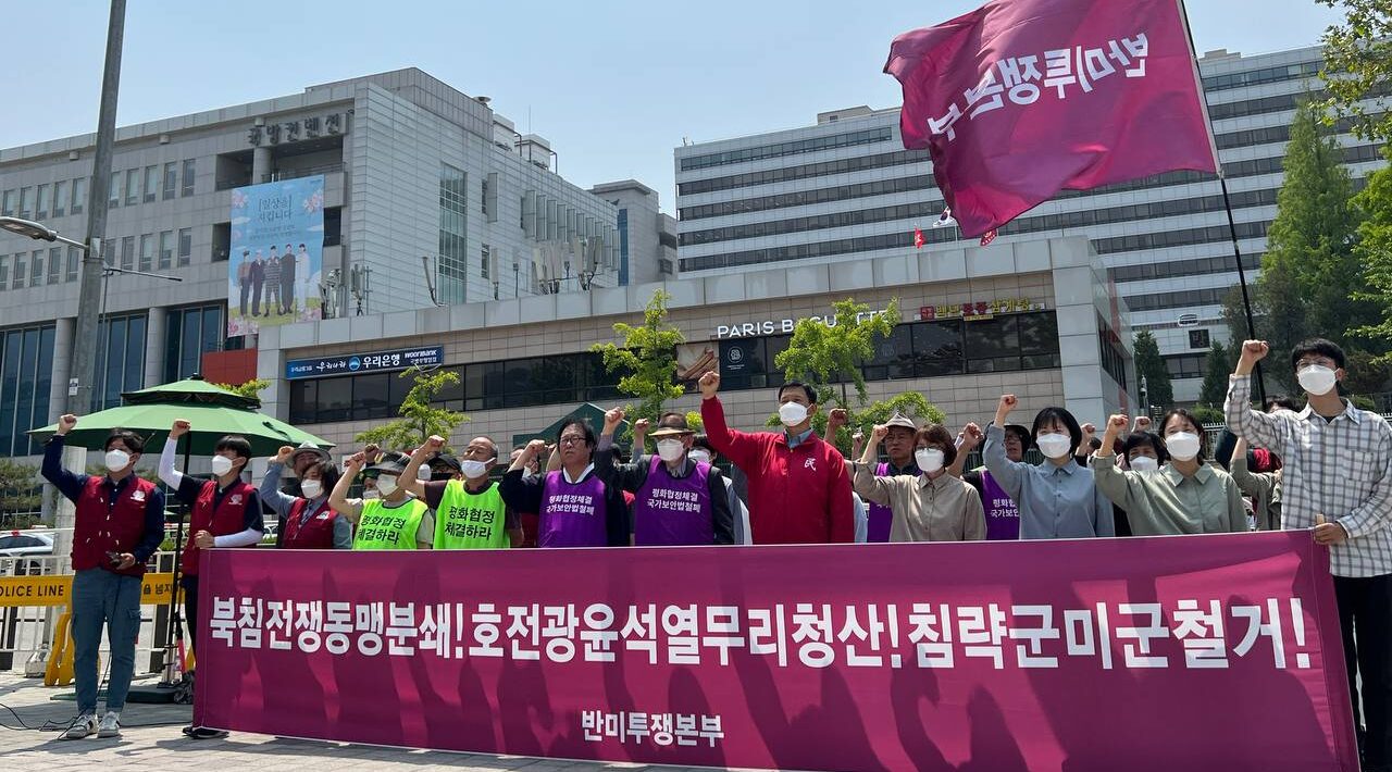 행진후 국방부집무실앞에서 <북침전쟁동맹분쇄! 호전광윤석열무리청산! 침략군미군철거!> 반미투쟁본부 기자회견이 진행됐다.