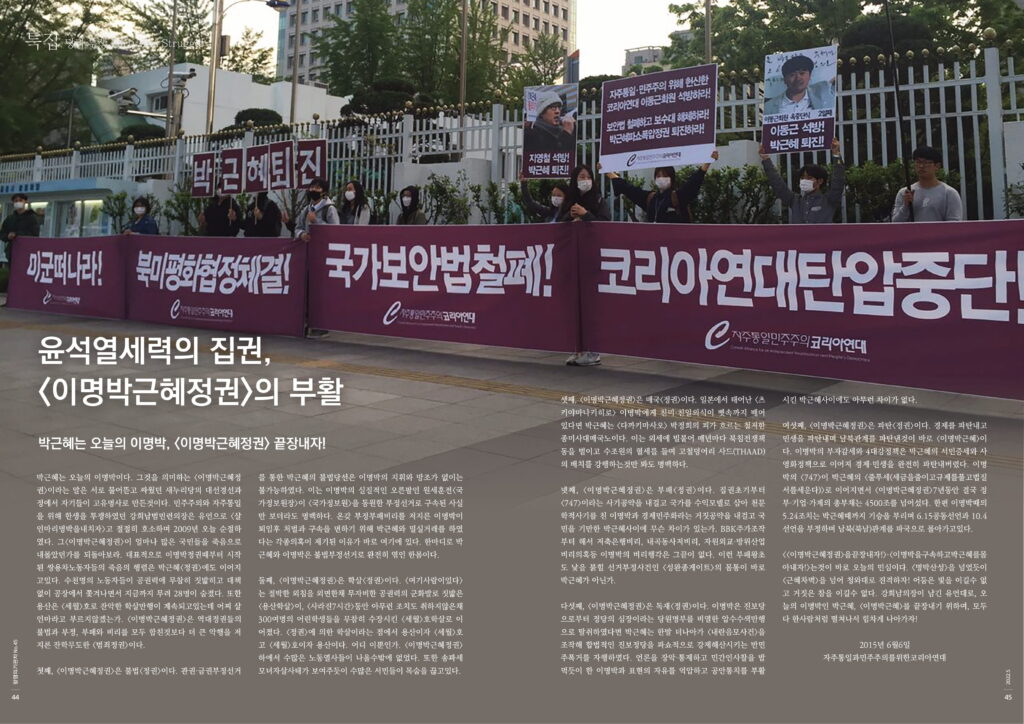 박근혜는 오늘의 이명박이다. 그것을 의미하는 <이명박근혜정권>이라는 말은 서로 물어뜯고 싸웠던 새누리당의 대선경선과정에서 자기들이 고유명사로 만든것이다. 민주주의와 자주통일을 위해 한생을 투쟁하였던 강희남범민련의장은 유언으로 <살인마리명박을내치자>고 절절히 호소하며 2009년 오늘 순절하였다. 그<이명박근혜정권>이 얼마나 많은 국민들을 죽음으로 내몰았던가를 되돌아보라. 대표적으로 이명박정권때부터 시작된 쌍용차노동자들의 죽음의 행렬은 박근혜<정권>에도 이어지고있다. 수천명의 노동자들이 공권력에 무참히 짓밟히고 대책없이 공장에서 쫓겨나면서 지금까지 무려 28명이 숨졌다. 또한 용산은 <세월>호로 잔악한 학살만행이 계속되고있는데 어찌 살인마라고 부르지않겠는가. <이명박근혜정권>은 역대정권들의 불법과 부정, 부패와 비리를 모두 합친것보다 더 큰 악행을 저지른 잔학무도한 <범죄정권>이다.