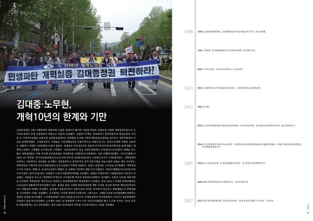 김대중정권은 1987 6월항쟁의 영향아래 수립된 정권이긴 했지만 거듭된 좌절과 실패속에 수립된 개혁정권이었으며 군사파쇼세력의 잔재 김종필과의 연합으로 힘들게 당선됐다. 김영삼시기에는 민족회의가 범민련중심의 통일운동과 거리를 둔 기회주의경향을 보였다면 김대중정권에서는 민화협을 조직해 기회주의통일운동세력을 흡수하고 정부차원에서 이들을 통제하려했다. 김대중정부는 악명높은 사상전향공작을 준법서약으로 바꿨는데 이는 양심수들에게 선택을 강요하는 교활하고 악랄한 사상전향과 다름이 없었다. 김대중은 중앙정보부를 계승한 안기부(국가안전기획부)를 없애지않고 개혁하는선에서 그체제를 유지하는데 노력했다. 1990년대부터 줄곧 유엔인권위에서 보안법(국가보안법)의 개폐를 권고했고 개혁정권들은 이에 부응해 보안법개정을 약속했지만 <대한민국>국회에서는 이를 이행하지못했다. <국가인권위>가 2003~04 작성한 <국가보안법실태조사>보고서에 따르면 김대중정권5년간 보안법구속자가 1058명이었다. 개혁정권의 여대야소 국회에서도 보안법은 유지됐다. 반민중적이고 반민주적인 정치·언론지형은 파쇼시대의 유물로 계속 이어졌다. 개혁정권의 기회속에 진보적대중정당인 민주노동당이 국회에 진출하는 성과도 있었지만 그이상을 넘지못했다. 개혁정권시기의 이른바 <개혁>은 군사파쇼정권이 때때로 쓴 유화책·기만책과 별반 다르지않았다. IMF(국제통화기금)신자유주의구조조정의 <설거지>를 맡은 김대중은 노동자·민중에게 희생을 강요했다. 실업과 비정규직의 고용불안정과 저임금이 강요됐다. 민중들의 분노가 <정권퇴진>투쟁으로 이어질무렵 역사상 첫남북수뇌회담이 성사됐다. 민중의 든든한 대중지반을 갖지못한 개혁정권은 역사적으로 내려오는 파쇼체제속에서 풍전등화의 신세였다. 결국 2004 노무현은 탄핵안통과로 사상초유의 대통령직무정지상태가 된다. 총선을 앞둔 시점에 열린우리당에 대한 지지를 호소한 발언에 새천년민주당이 나서 대통령의 탄핵을 추진했다. 총선에서 열린우리당이 과반이상의 의석을 차지하며 압승하고 헌법재판소가 탄핵심판을 기각하면서 사태는 종결됐다. 선거결과는 민의를 반영하고있었지만 그힘으로도 그해말 추진된 보안법철폐투쟁에서는 개정의 성과를 내지못했다. 노무현정권에서 2003 대북송금사건으로 김대중정권의 박지원장관이 구속되고 정몽헌현대아산회장이 끝내 투신자살했다. 노무현은 2007.10 정권말에 가서야 겨우 남북수뇌회담을 했고 노무현 자신이 그토록 강조한 검찰개혁에는 손도 대지못했다. 결국 2009 정치검찰의 강박을 이겨내지못하고 자살을 선택했다.