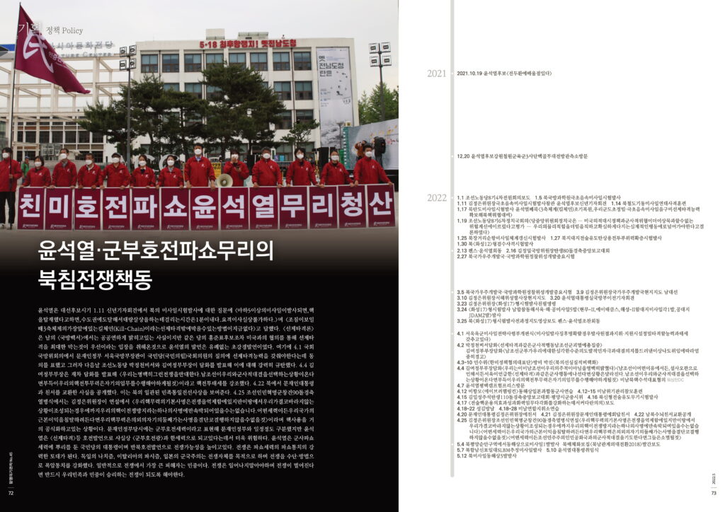 윤석열은 대선후보시기 1.11 신년기자회견에서 북의 미사일시험발사에 대한 질문에 <마하5이상의미사일이발사되면,핵을탑재했다고하면,수도권에도달해서대량살상을하는데걸리는시간은1분이내다.요격이사실상불가하다.>며 <조짐이보일때3축체제의가장앞에있는킬체인(Kill-Chain)이라는선제타격밖에막을수있는방법이지금없다>고 답했다. <선제타격론>은 남의 <국방백서>에서는 공공연하게 밝히고있는 사실이지만 같은 당의 홍준표후보조차 미국과의 협의를 통해 선제타격을 최대한 막는것이 우선이라는 입장을 취해온것으로 윤석열의 발언은 유례없는 초강경발언이었다. 여기에 4.1 국회국방위회의에서 문재인정부 서욱국방부장관이 국민당(국민의힘)국회의원의 질의에 선제타격능력을 갖춰야한다는데 동의를 표했고 그러자 다음날 조선노동당 박정천비서와 김여정부부장이 담화를 발표해 이에 대해 강력히 규탄했다. 4.4 김여정부부장은 재차 담화를 발표해 <우리는명백히그런전쟁을반대한다.남조선이우리와군사적대결을선택하는상황이온다면부득이우리의핵전투무력은자기의임무를수행해야하게될것>이라고 핵전투태세를 강조했다. 4.22 북에서 문재인대통령과 친서를 교환한 사실을 공개했다. 이는 북의 일관된 민족통일전선사상을 보여준다. 4.25 조선인민혁명군창건90돌경축열병식에서는 김정은위원장이 연설에서 <우리핵무력의기본사명은전쟁을억제함에있지만이땅에서우리가결코바라지않는상황이조성되는경우에까지우리의핵이전쟁방지라는하나의사명에만속박되어있을수는없습니다.어떤세력이든우리국가의근본이익을침탈하려든다면우리핵무력은의외의자기의둘째가는사명을결단코결행하지않을수없을것>이라며 핵사용을 거의 공식화하고있는 상황이다. 문재인정부당시에는 군부호전세력이라고 표현해 문재인정부와 일정정도 구분했지만 윤석열은 <선제타격>등 호전발언으로 사실상 <군부호전광>과 한세력으로 되고있다는데서 더욱 위험하다. 윤석열은 군사파쇼세력에 뿌리를 둔 국민당의 대통령이며 반북호전발언으로 전쟁가능성을 높이고있다. 전쟁은 파쇼세력의 파쇼통치의 강력한 토대가 된다. 독일의 나치즘, 이탈리아의 파시즘, 일본의 군국주의는 전쟁자체를 목적으로 하며 전쟁을 수단·방법으로 폭압통치를 강화했다. 일반적으로 전쟁에서 가장 큰 피해자는 민중이다. 전쟁은 일어나지말아야하며 전쟁이 벌어진다면 반드시 우리민족과 민중이 승리하는 전쟁이 되도록 해야한다.