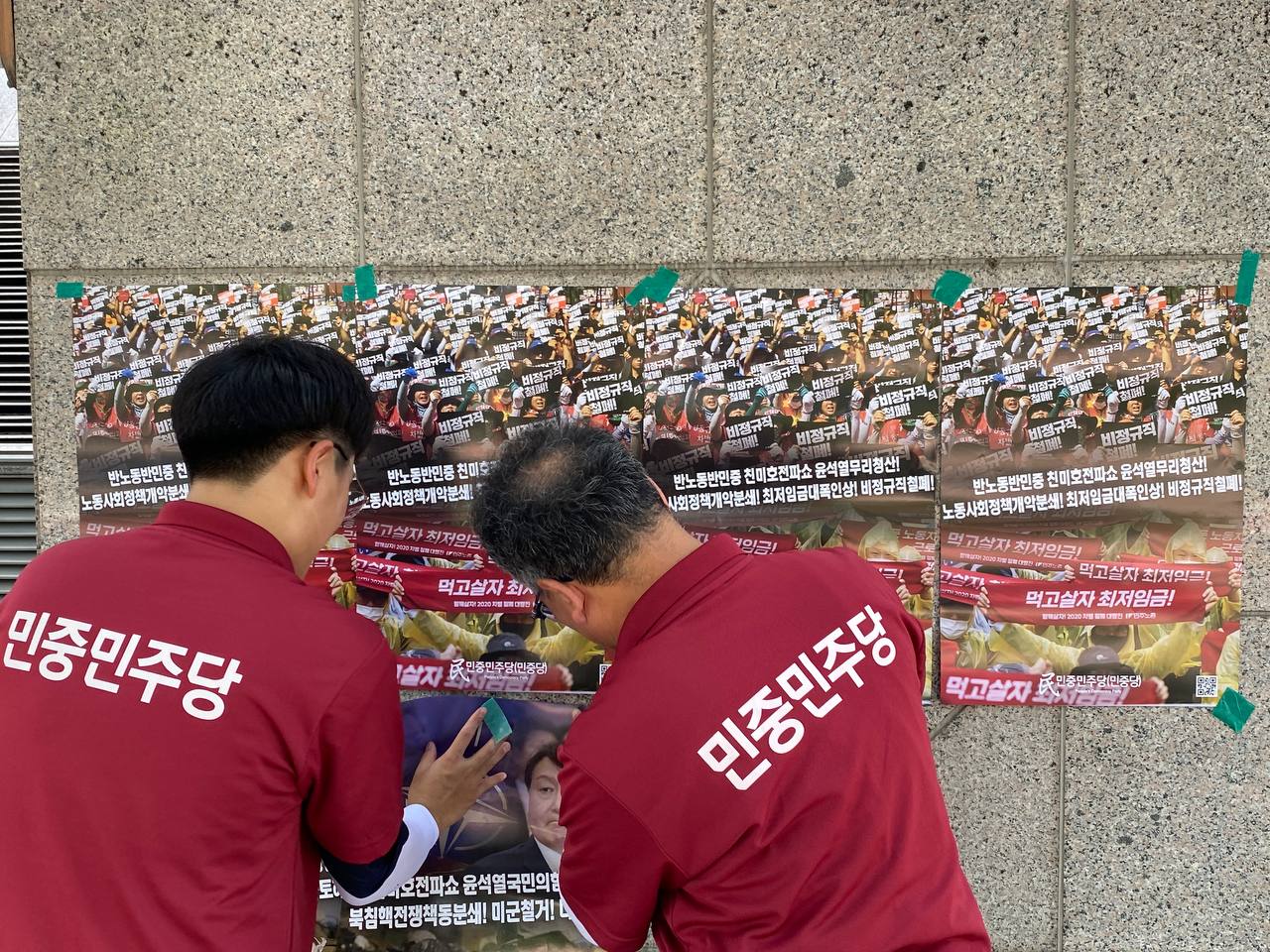 민중민주당은 포스터 <반노동반민중 친미호전파쇼 윤석열무리청산! 노동사회정책개악분쇄! 최저임금대폭인상! 비정규직철폐!>, <친미호전파쇼 윤석열국민의힘청산! 북침핵전쟁책동분쇄! 미군철거! 나토해체!>를 대회장소일대에 총 600여장 부착했다.