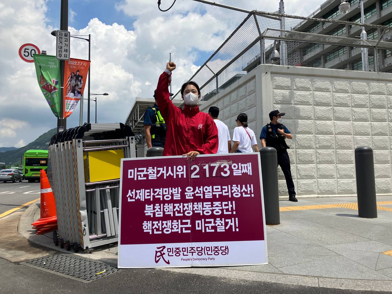1일 민중민주당(민중당)은 미대사관앞에서 <선제타격망발 윤석열무리청산! 북침핵전쟁책동중단! 핵전쟁화근 미군철거!> 구호를 들고 평화시위를 2173일째 전개했다.