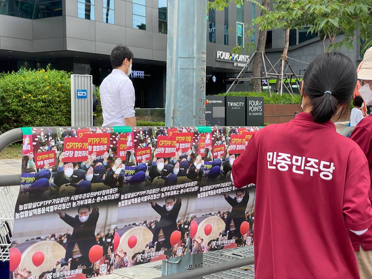 한쪽에서는 <CPTPP가입중단>, <반농민윤석열무리청산> 글자피시를 길게 펼치고 농민들을 지지·응원했다. 농민들은 민중민주당의 구호에 집중하며 큰 박수와 함성으로 응답했다.