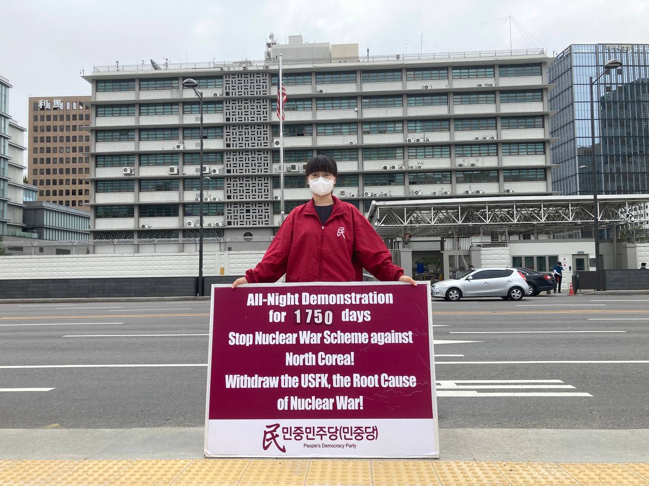 12일 민중민주당(민중당)은 미대사관앞에서 <선제타격망발 윤석열무리청산! 북침핵전쟁책동중단! 핵전쟁화근 미군철거!> 구호를 들고 평화시위를 2184일째 전개했다.