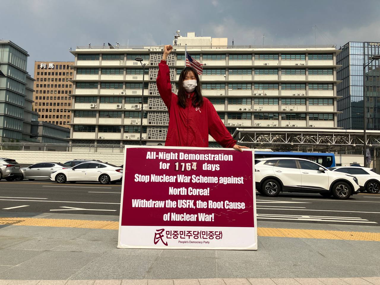 26일 민중민주당(민중당)은 미대사관앞에서 <선제타격망발 윤석열무리청산! 북침핵전쟁책동중단! 핵전쟁화근 미군철거!> 구호를 들고 평화시위를 2198일째 전개했다.