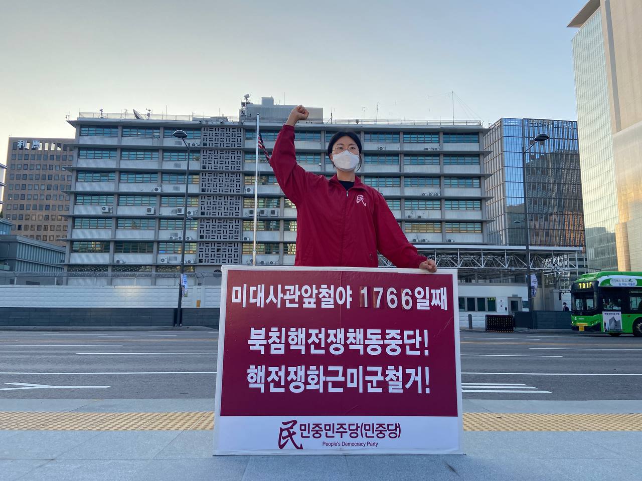 28일 민중민주당(민중당)은 미대사관앞에서 <선제타격망발 윤석열무리청산! 북침핵전쟁책동중단! 핵전쟁화근 미군철거!> 구호를 들고 평화시위를 2200일째 전개했다.