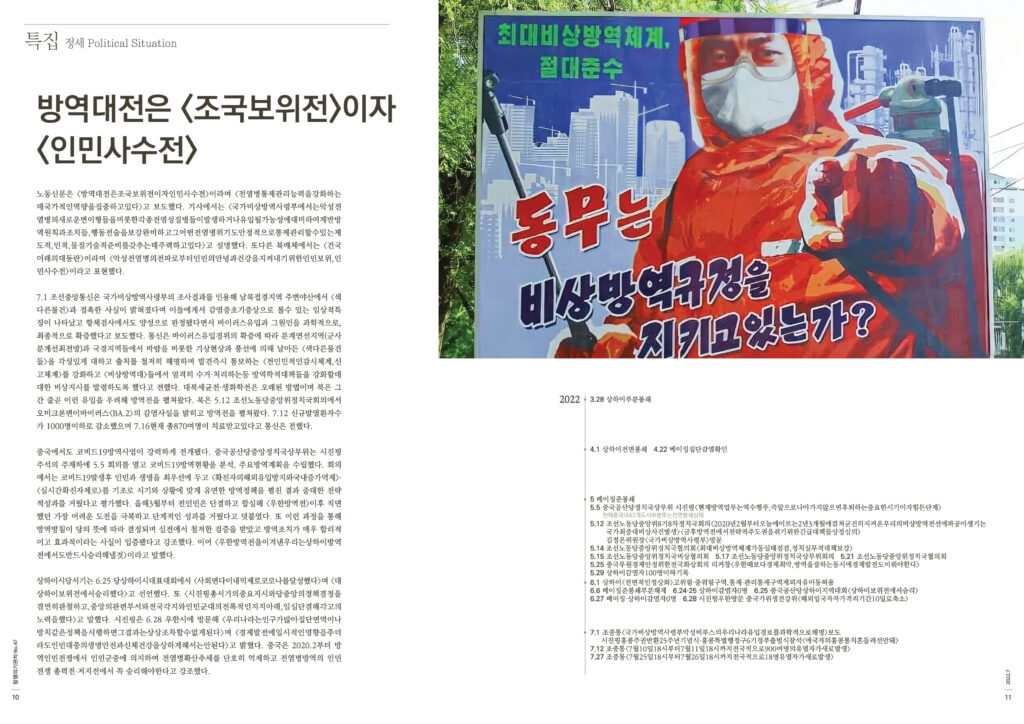 노동신문은 <방역대전은조국보위전이자인민사수전>이라며 <전염병통제관리능력을강화하는데국가적인역량을집중하고있다>고 보도했다. 기사에서는 <국가비상방역사령부에서는악성전염병의새로운변이형들을비롯한각종전염성질병들이발생하거나유입될가능성에대비하여제반방역원칙과조치들,행동전술을보강완비하고그어떤전염병위기도안정적으로통제관리할수있는제도적,인적,물질기술적준비를갖추는데주력하고있다>고 설명했다. 또다른 북매체에서는 <건국이래의대동란>이라며 <악성전염병의전파로부터인민의안녕과건강을지켜내기위한인민보위,인민사수전>이라고 표현했다.