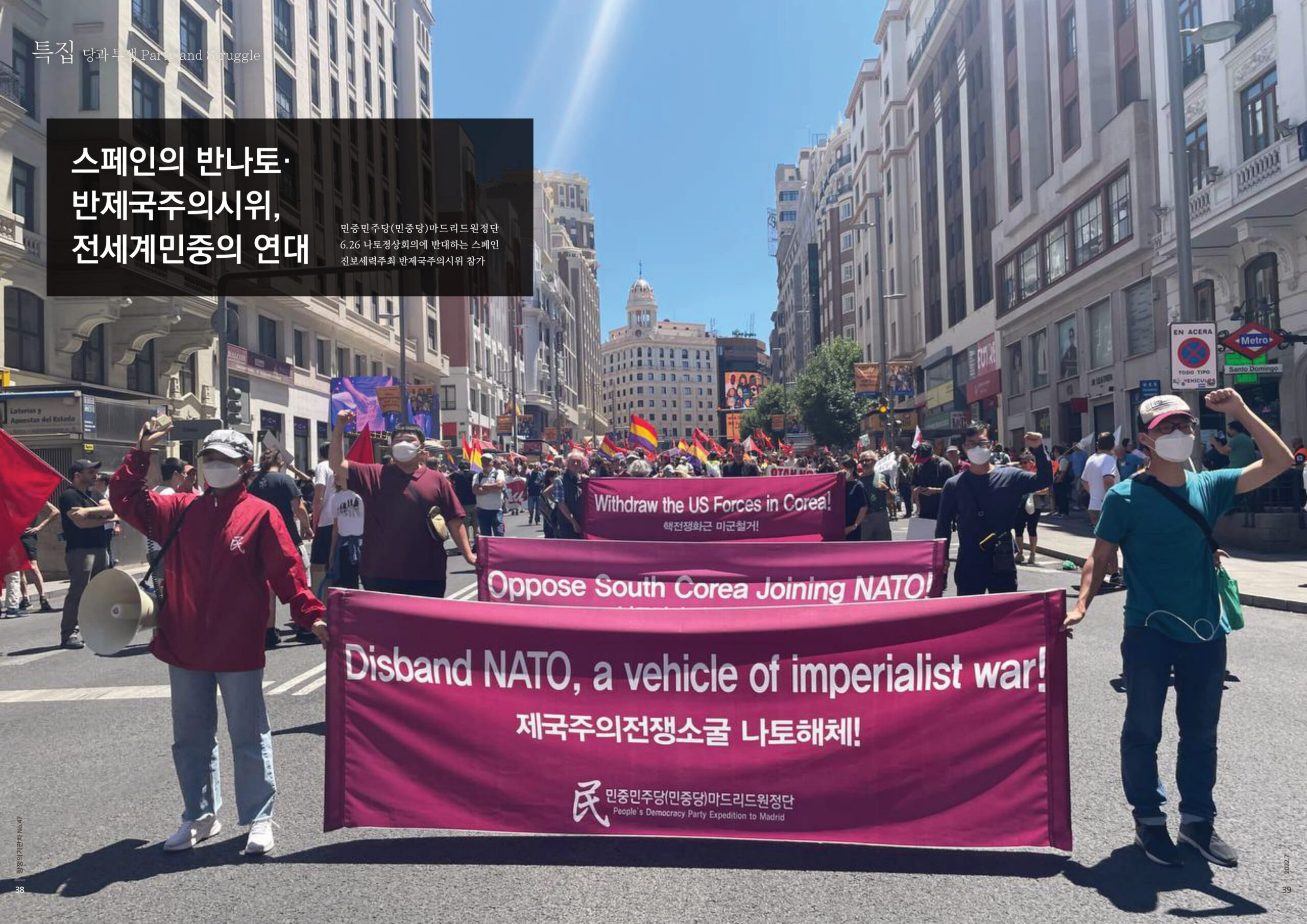 항쟁의기관차 〈2022.7 항쟁의기관차〉 스페인의 반나토·반제국주의시위, 전세계민중의 연대 2022년 8월 1일 FacebookTwitter 민중민주당(민중당)마드리드원정단 6.26 나토정상회의에 반대하는 스페인진보세력주최 반제국주의시위 참가