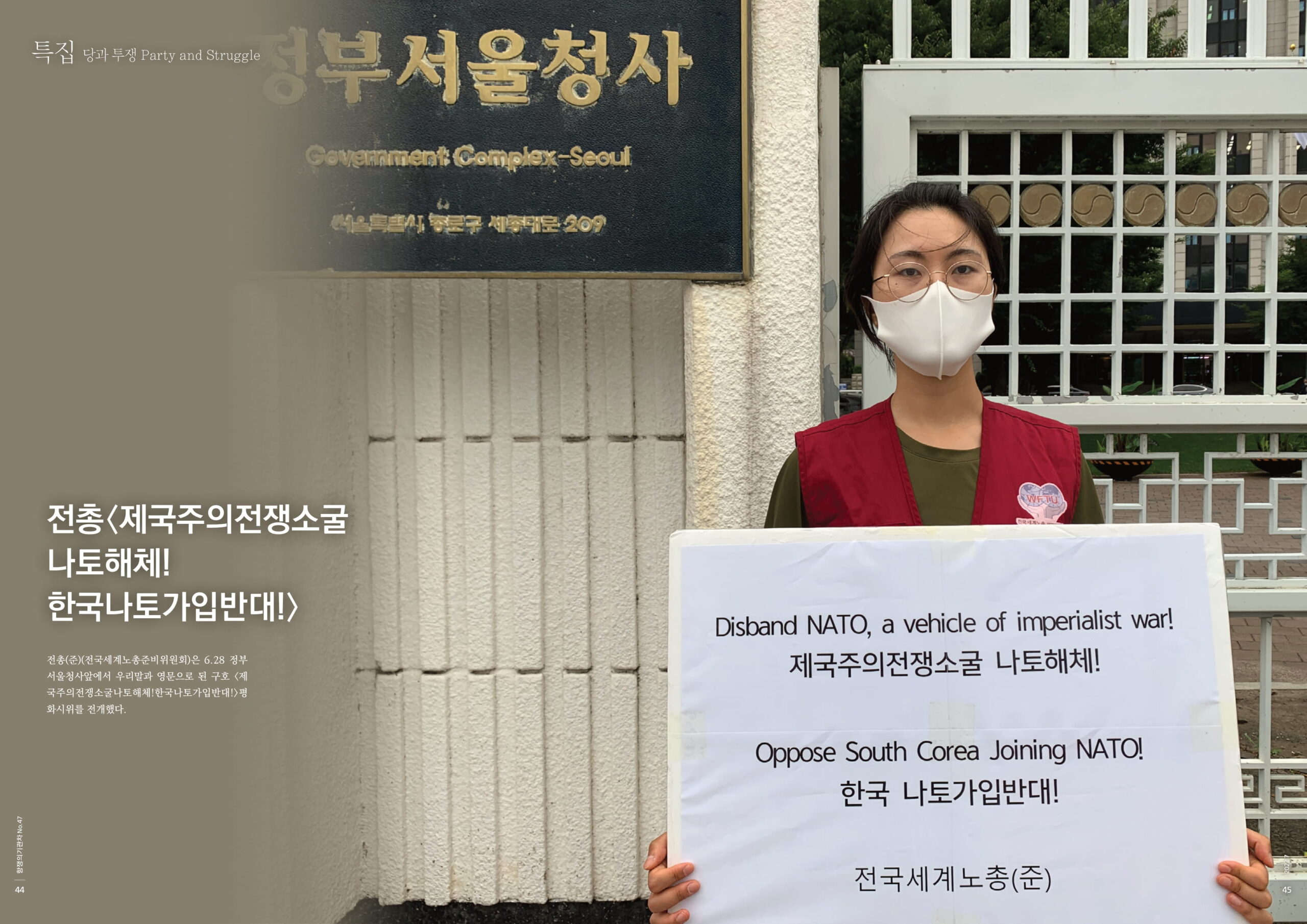 항쟁의기관차 〈2022.7 항쟁의기관차〉 전총〈제국주의전쟁소굴나토해체!한국나토가입반대!〉 2022년 8월 1일 FacebookTwitter 전총(준)(전국세계노총준비위원회)은 6.28 정부서울청사앞에서 우리말과 영문으로 된 구호 <제국주의전쟁소굴나토해체!한국나토가입반대!>평화시위를 전개했다.