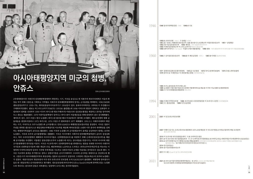 2차세계대전이후 사회주의·민족해방혁명세력이 확장하는 시기, 미국을 중심으로 한 자본주의·제국주의세력은 이들의 확장을 막기 위해 <냉전>을 기획하고 지역별로 사회주의·민족해방혁명세력에 맞서는 군사동맹을 획책한다. 나토(1949)와 센토(중앙조약기구 1955~79), 세아토(동남아시아조약기구 1954)등이 있다. 동북아시아에서도 <네아토>가 추진됐으나 구체화되지못했다. 센토는 바그다드조약기구(METO 1955)로 출발했는데 1958 이라크의 왕정이 전복되고 공화정이 수립되면서 탈퇴를 선언하자 1959 미국이 파키스탄·튀르키예(터키)·이란3국과 상호원조협정을 체결하고 본부를 앙카라에 두고 센토로 재출범했다. 1979 이란이슬람혁명이 일어나고 파키스탄이 비동맹운동을 위해 탈퇴하자 결국 정식해체됐다. 세아토의 경우, 호주·프랑스·영국·뉴질랜드·파키스탄·필리핀·태국·미국8개국이 참여해 조직됐다. 베트남전쟁에 대해 공동대응을 결정하지못하고 1973 파키스탄, 1974 프랑스가 탈퇴하면서 1977 해체됐다. 1951.9.1 사회주의세력이 확장하는 시기, 미국주도로 호주·뉴질랜드와 군사동맹으로 안쥬스(ANZUS 태평양안전보장조약)를 결성한다. 미국은 일본이 주권을 회복한 샌프란시스코 대일강화조약체결직전 이조약을 체결해 세아토창설등 소련과 이후 중국의 세력확장을 견제하는 태평양지역진출의 교두보로 활용했다. 1986 미국과 뉴질랜드의 군사동맹조약이 효력을 상실하면서 현재는 호주와 뉴질랜드, 미국과 호주의 군사동맹체제로 전환됐다. 미국은 아시아에서 사회주의·민족해방혁명역량이 급속히 장성강화되고, 특히 코리아전쟁에서 패배하자 아시아국가들로 <강력한반공보루>를 마련하기 위해 <3개국안전보장조약>을 체결해 군사동맹을 추진했다. 이동맹은 알류산열도로부터 뉴질랜드에 이르는 섬나라들을 연결시키는 미국의 아시아에 대한 군사동맹체계의 한부분을 이룬다. 미국은 이<조약>에서 <잠재적침략자>를 반대한다는 명분을 내세워 아시아의 사회주의 국가들과 신생독립국가들에 대한 개입과 간섭, 패권적야망을 노골적으로 드러내고 <외부로부터무력공격>을 막는다는 미명하에 이지역나라들에 임의의 시각에 무력개입을 시도하고 성원국가들의 군대를 마음대로 끌어들일수 있도록 했다. 미국은 이조약의 효력을 무기한으로 정하고 성원국가들을 군사기지화하며 그나라의 군사력을 대대적으로 증강하도록 했다. <냉전>시기 아시아태평양지역의 최전선에는 일본과 남코리아가 있었다면 그후방에 <앵글로색슨>의 호주와 뉴질랜드가 있었다. 대중국전선이 형성되면서 미국·영국·호주3국의 안보동맹 오커스(AUKUS)가 출범했다. 태평양에 영어권국가들로 된 <앵글로색슨>군사동맹이라고 평가됐다. 정보공유동맹<파이브아이스(Five Eyes)>(1956)에 참여하고있는 뉴질랜드와 캐나다는 중국과의 갈등은 피하겠다는 입장에서 오커스에는 참가하지않았다.