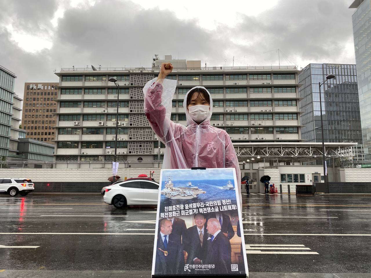9일 민중민주당(민중당)은 미대사관앞에서 <선제타격망발 윤석열무리청산! 북침핵전쟁책동중단! 핵전쟁화근 미군철거!> 구호를 들고 평화시위를 2212일째 전개했다.