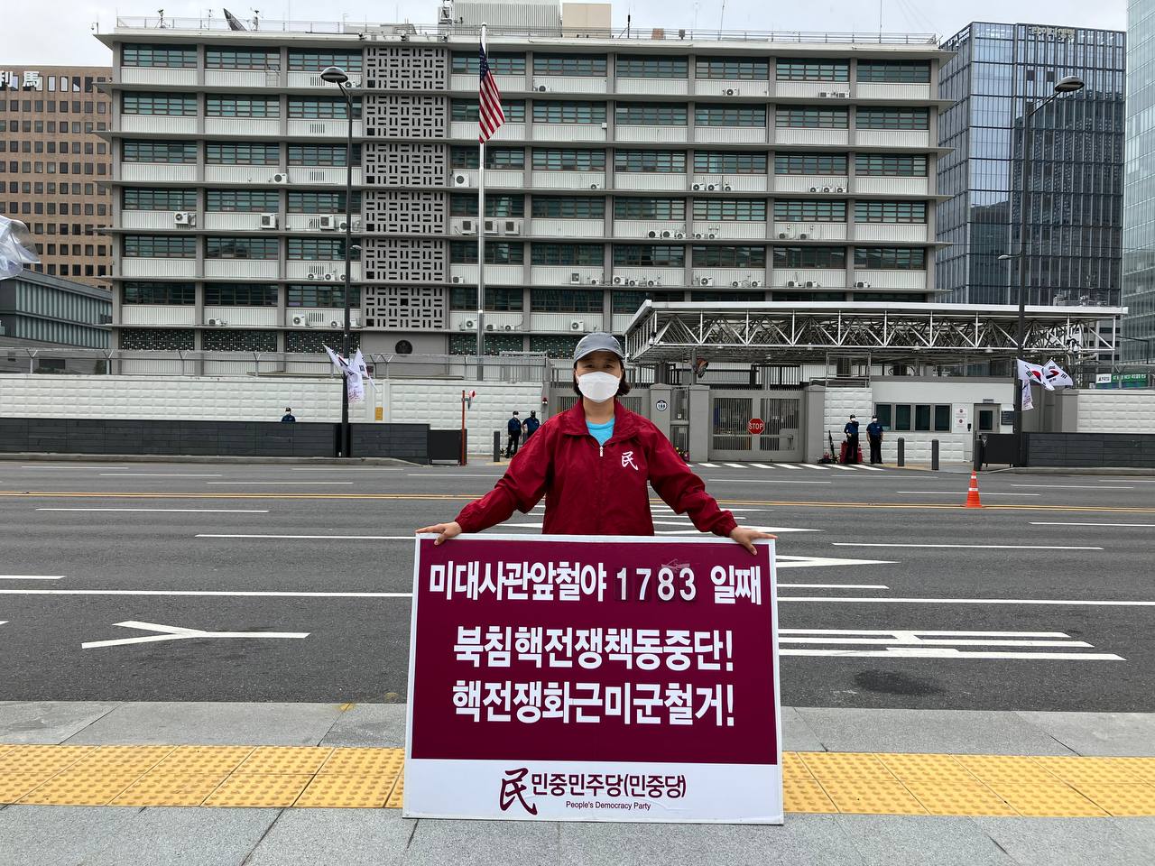 14일 민중민주당(민중당)은 미대사관앞에서 <선제타격망발 윤석열무리청산! 북침핵전쟁책동중단! 핵전쟁화근 미군철거!> 구호를 들고 평화시위를 2217일째 전개했다.