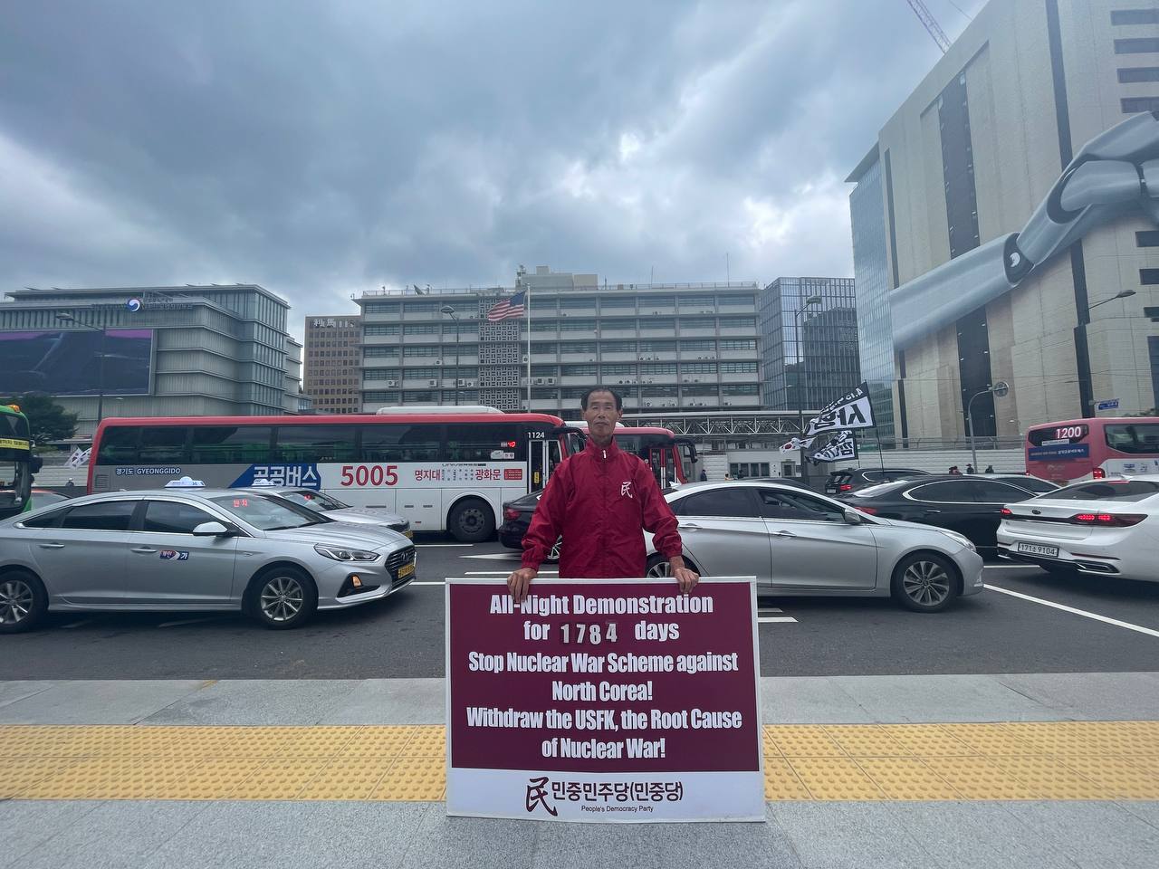 15일 민중민주당(민중당)은 미대사관앞에서 <선제타격망발 윤석열무리청산! 북침핵전쟁책동중단! 핵전쟁화근 미군철거!> 구호를 들고 평화시위를 2218일째 전개했다.