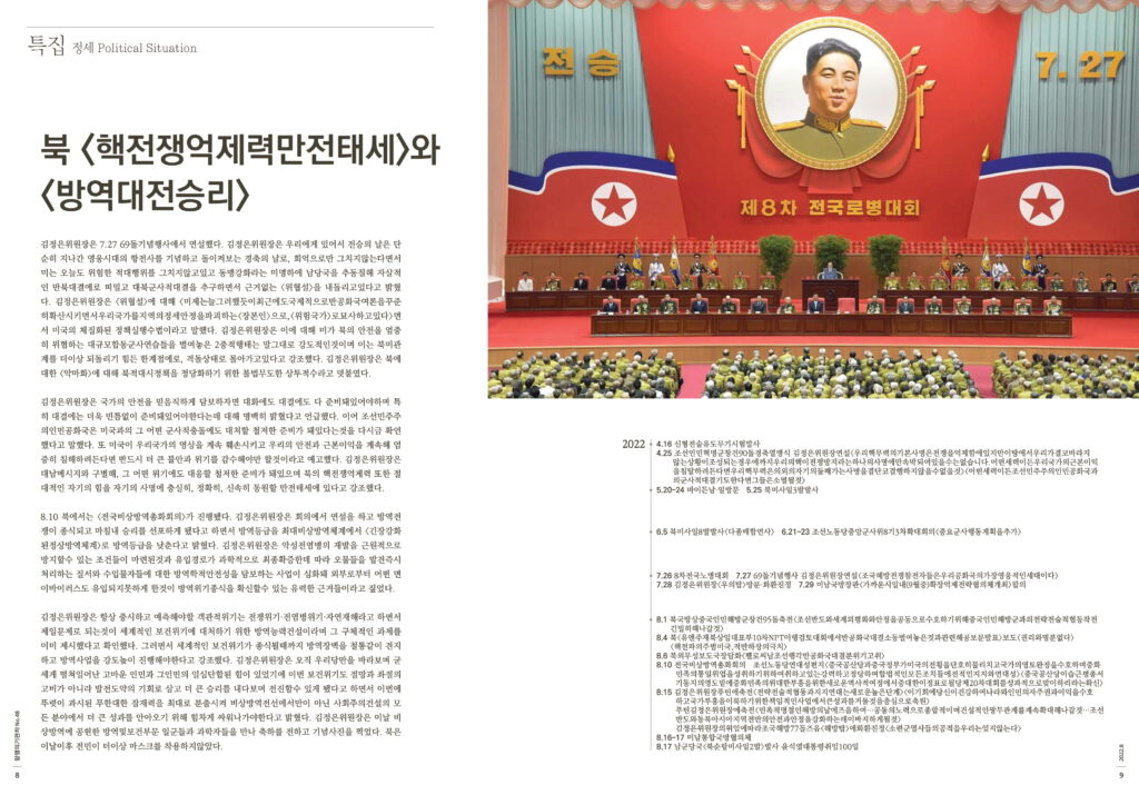 8.10 북에서는 <전국비상방역총화회의>가 진행됐다. 김정은위원장은 회의에서 연설을 하고 방역전쟁이 종식되고 마침내 승리를 선포하게 됐다고 하면서 방역등급을 최대비상방역체계에서 <긴장강화된정상방역체계>로 방역등급을 낮춘다고 밝혔다. 김정은위원장은 악성전염병의 재발을 근원적으로 방지할수 있는 조건들이 마련된것과 유입경로가 과학적으로 최종확증한데 따라 오물들을 발견즉시 처리하는 질서와 수입물자들에 대한 방역학적안전성을 담보하는 사업이 심화돼 외부로부터 어떤 변이바이러스도 유입되지못하게 한것이 방역위기종식을 확신할수 있는 유력한 근거들이라고 짚었다.