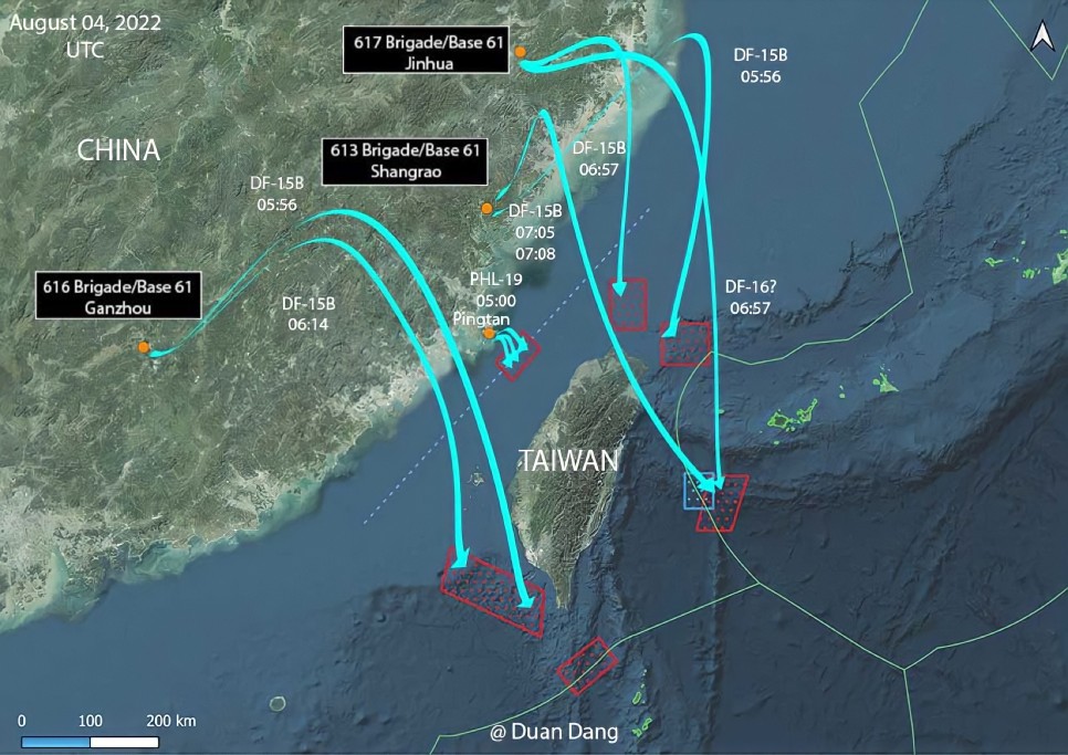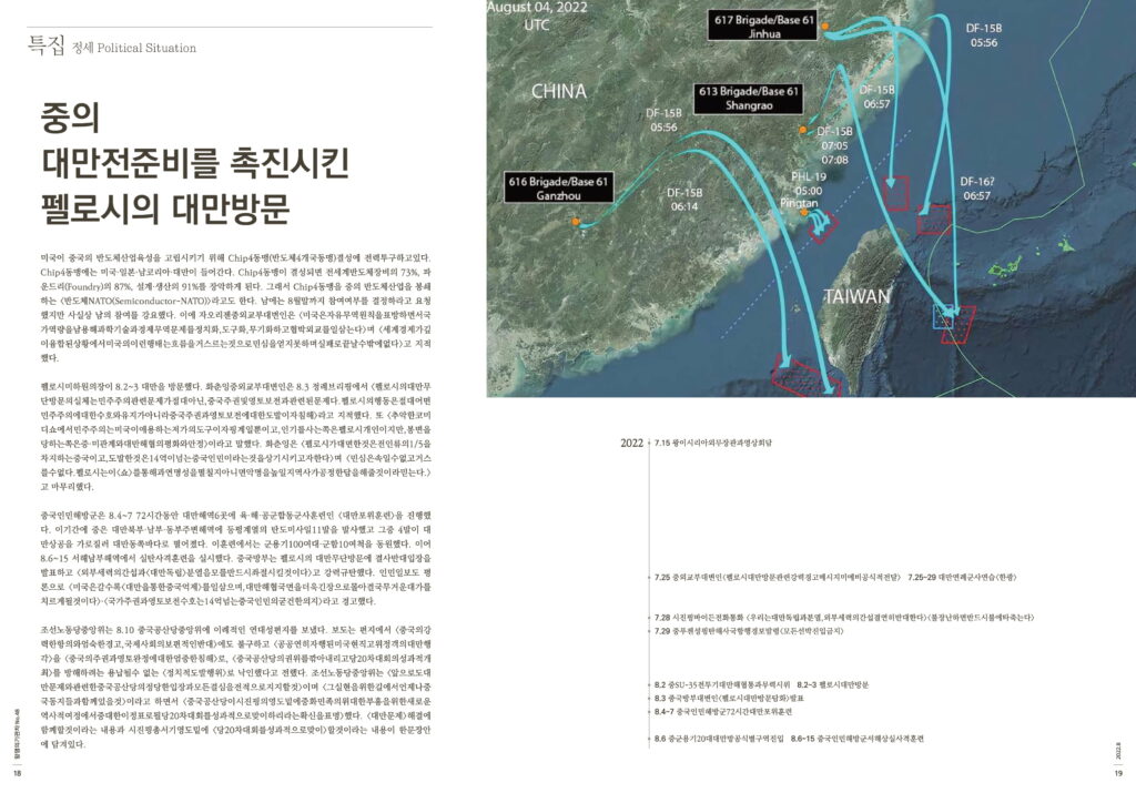 중국인민해방군은 8.4~7 72시간동안 대만해역6곳에 육·해·공군합동군사훈련인 <대만포위훈련>을 진행했다. 이기간에 중은 대만북부·남부·동부주변해역에 둥펑계열의 탄도미사일11발을 발사했고 그중 4발이 대만상공을 가로질러 대만동쪽바다로 떨어졌다. 이훈련에서는 군용기100여대·군함10여척을 동원했다. 이어 8.6~15 서해남부해역에서 실탄사격훈련을 실시했다. 중국방부는 펠로시의 대만무단방문에 결사반대입장을 발표하고 <외부세력의간섭과<대만독립>분열음모를반드시좌절시킬것이다>고 강력규탄했다. 인민일보도 평론으로 <미국은갈수록<대만을통한중국억제>를일삼으며,대만해협국면을더욱긴장으로몰아결국무거운대가를치르게될것이다>·<국가주권과영토보전수호는14억넘는중국인민의굳건한의지>라고 경고했다.