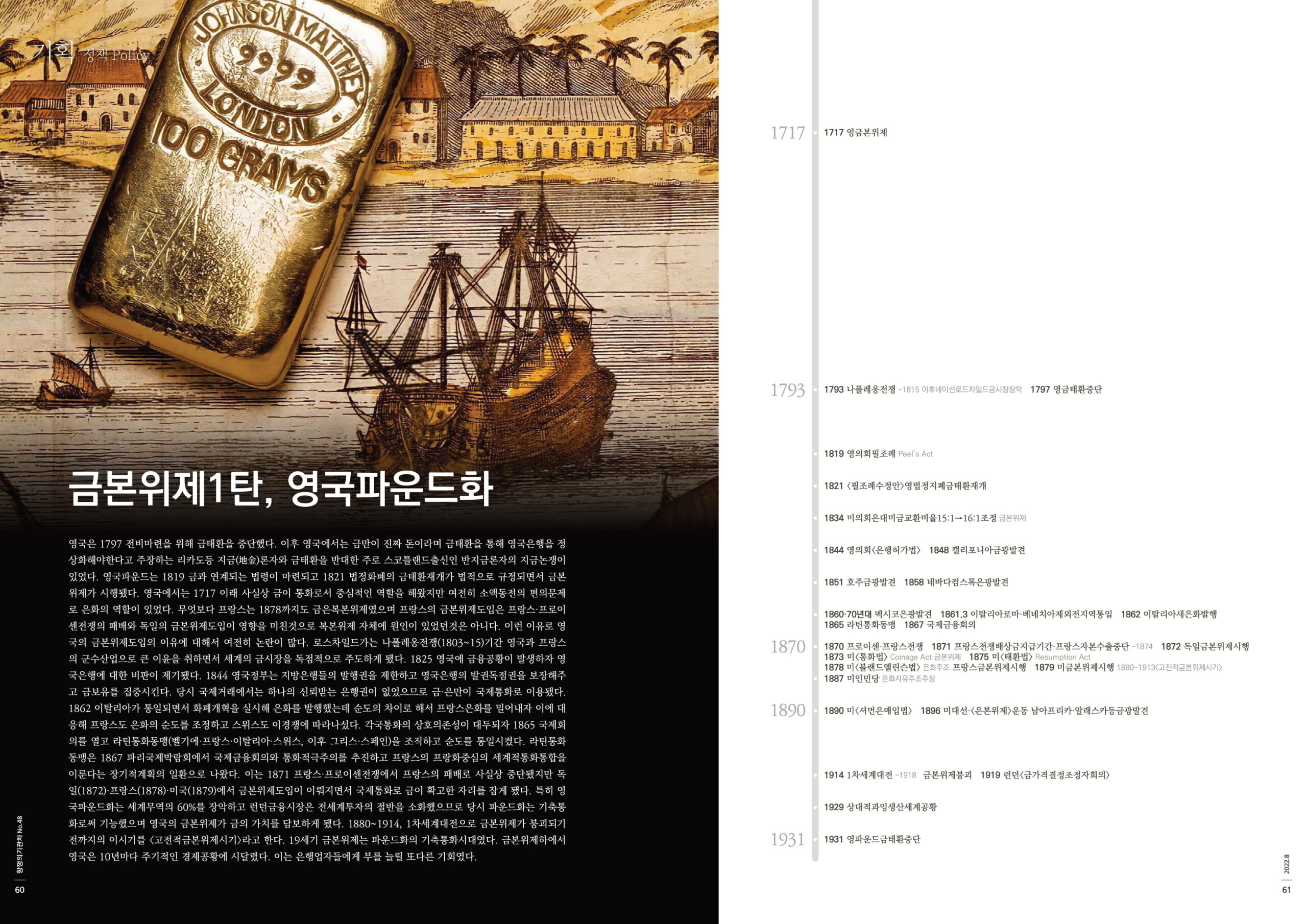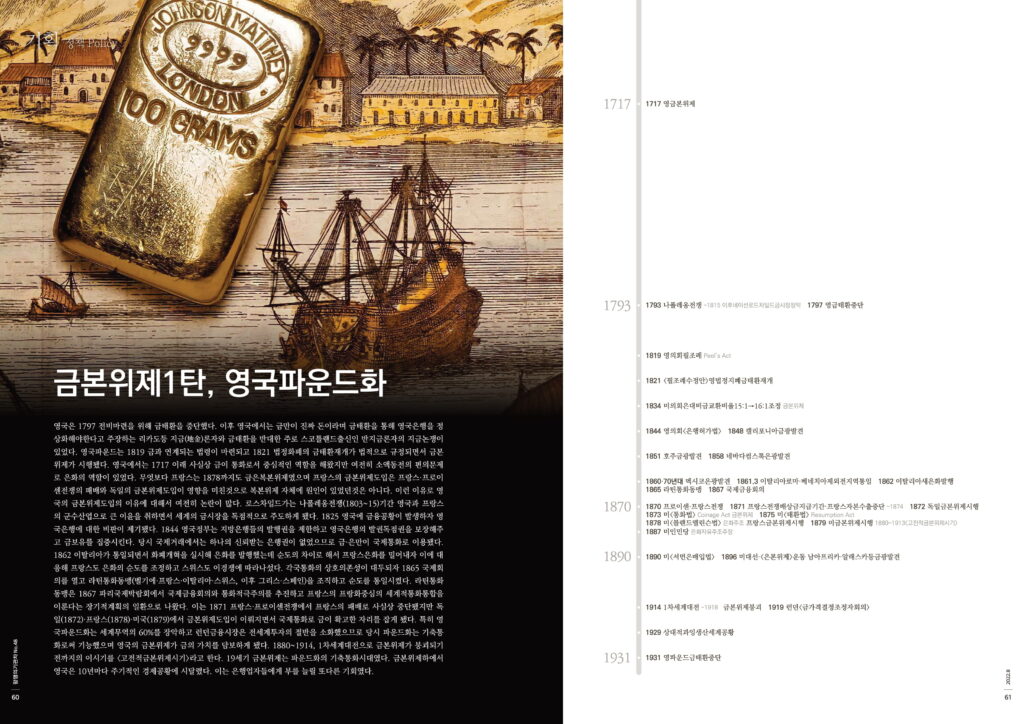 영국은 1797 전비마련을 위해 금태환을 중단했다. 이후 영국에서는 금만이 진짜 돈이라며 금태환을 통해 영국은행을 정상화해야한다고 주장하는 리카도등 지금(地金)론자와 금태환을 반대한 주로 스코틀랜드출신인 반지금론자의 지금논쟁이 있었다. 영국파운드는 1819 금과 연계되는 법령이 마련되고 1821 법정화폐의 금태환재개가 법적으로 규정되면서 금본위제가 시행됐다. 영국에서는 1717 이래 사실상 금이 통화로서 중심적인 역할을 해왔지만 여전히 소액동전의 편의문제로 은화의 역할이 있었다. 무엇보다 프랑스는 1878까지도 금은복본위제였으며 프랑스의 금본위제도입은 프랑스·프로이센전쟁의 패배와 독일의 금본위제도입이 영향을 미친것으로 복본위제 자체에 원인이 있었던것은 아니다. 이런 이유로 영국의 금본위제도입의 이유에 대해서 여전히 논란이 많다. 로스차일드가는 나폴레옹전쟁(1803~15)기간 영국과 프랑스의 군수산업으로 큰 이윤을 취하면서 세계의 금시장을 독점적으로 주도하게 됐다. 1825 영국에 금융공황이 발생하자 영국은행에 대한 비판이 제기됐다. 1844 영국정부는 지방은행들의 발행권을 제한하고 영국은행의 발권독점권을 보장해주고 금보유를 집중시킨다. 당시 국제거래에서는 하나의 신뢰받는 은행권이 없었으므로 금·은만이 국제통화로 이용됐다. 1862 이탈리아가 통일되면서 화폐개혁을 실시해 은화를 발행했는데 순도의 차이로 해서 프랑스은화를 밀어내자 이에 대응해 프랑스도 은화의 순도를 조정하고 스위스도 이경쟁에 따라나섰다. 각국통화의 상호의존성이 대두되자 1865 국제회의를 열고 라틴통화동맹(벨기에·프랑스·이탈리아·스위스, 이후 그리스·스페인)을 조직하고 순도를 통일시켰다. 라틴통화동맹은 1867 파리국제박람회에서 국제금융회의와 통화적극주의를 추진하고 프랑스의 프랑화중심의 세계적통화통합을 이룬다는 장기적계획의 일환으로 나왔다. 이는 1871 프랑스·프로이센전쟁에서 프랑스의 패배로 사실상 중단됐지만 독일(1872)·프랑스(1878)·미국(1879)에서 금본위제도입이 이뤄지면서 국제통화로 금이 확고한 자리를 잡게 됐다. 특히 영국파운드화는 세계무역의 60%를 장악하고 런던금융시장은 전세계투자의 절반을 소화했으므로 당시 파운드화는 기축통화로써 기능했으며 영국의 금본위제가 금의 가치를 담보하게 됐다. 1880~1914, 1차세계대전으로 금본위제가 붕괴되기전까지의 이시기를 <고전적금본위제시기>라고 한다. 19세기 금본위제는 파운드화의 기축통화시대였다. 금본위제하에서 영국은 10년마다 주기적인 경제공황에 시달렸다. 이는 은행업자들에게 부를 늘릴 또다른 기회였다.