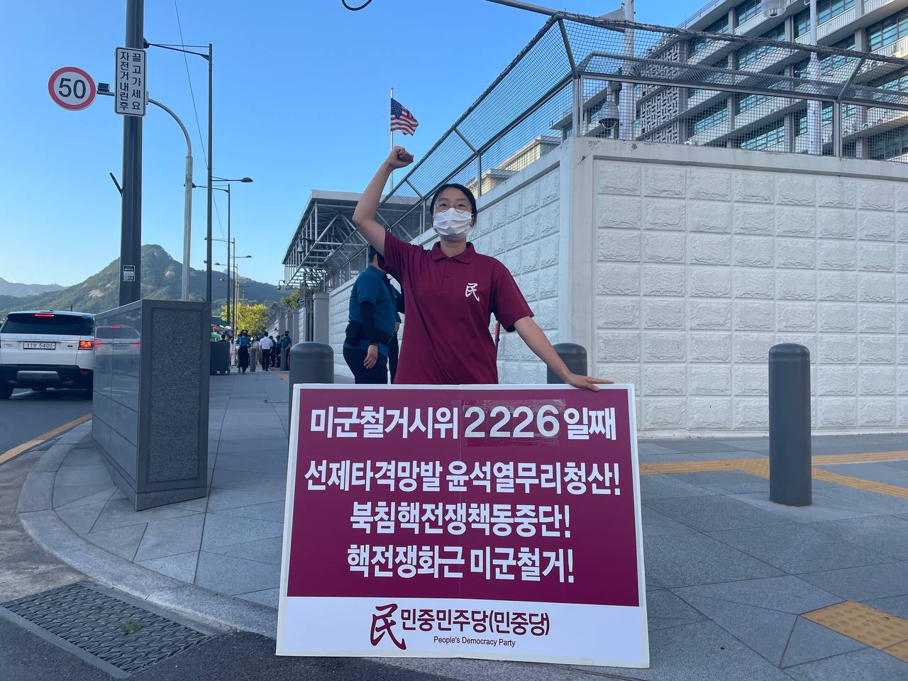 23일 민중민주당(민중당)은 미대사관앞에서 <선제타격망발 윤석열무리청산! 북침핵전쟁책동중단! 핵전쟁화근 미군철거!> 구호를 들고 평화시위를 2226일째 전개했다.