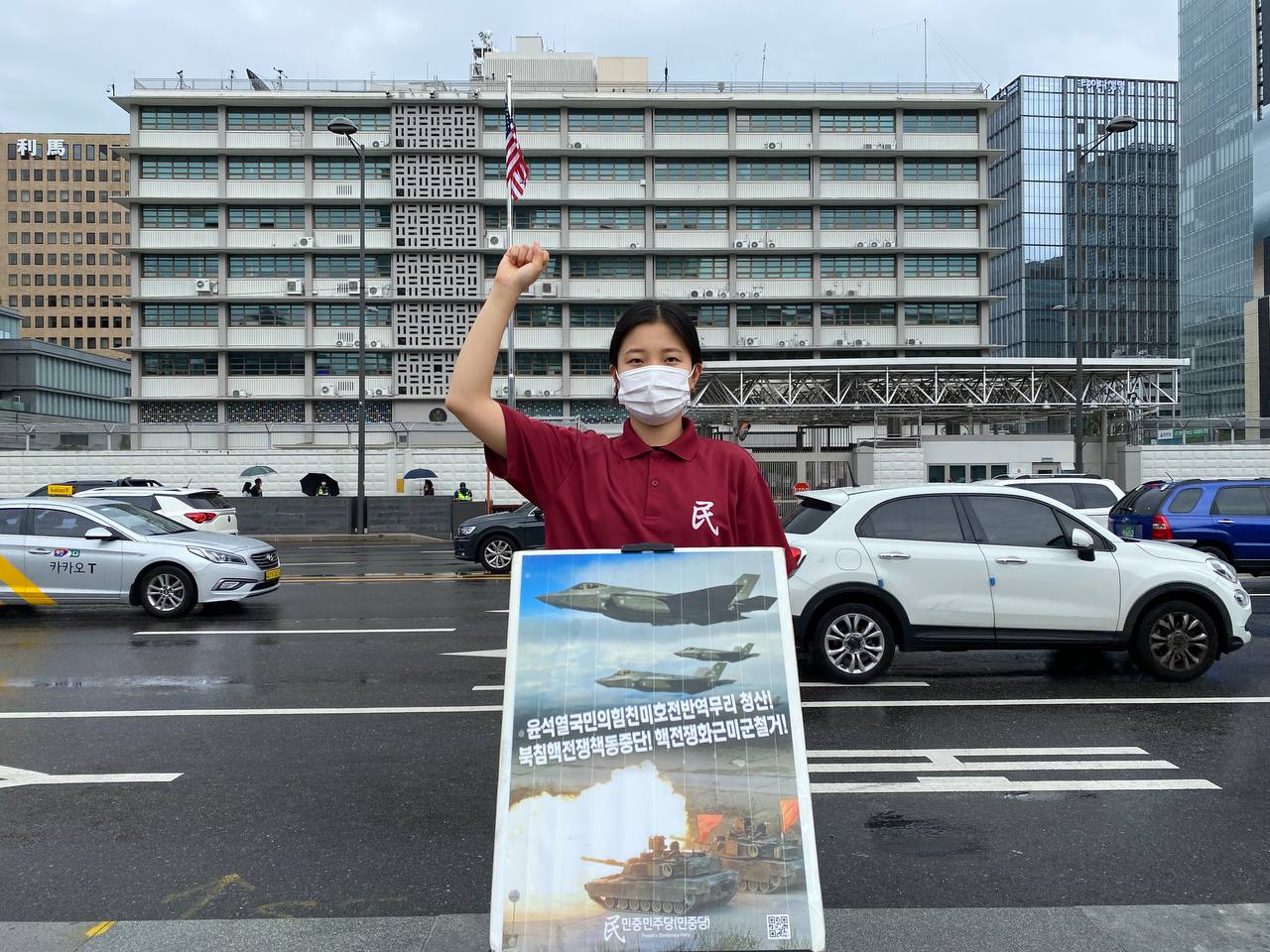 4일 민중민주당(민중당)은 미대사관앞에서 <선제타격망발 윤석열무리청산! 북침핵전쟁책동중단! 핵전쟁화근 미군철거!> 구호를 들고 평화시위를 2238일째 전개했다.