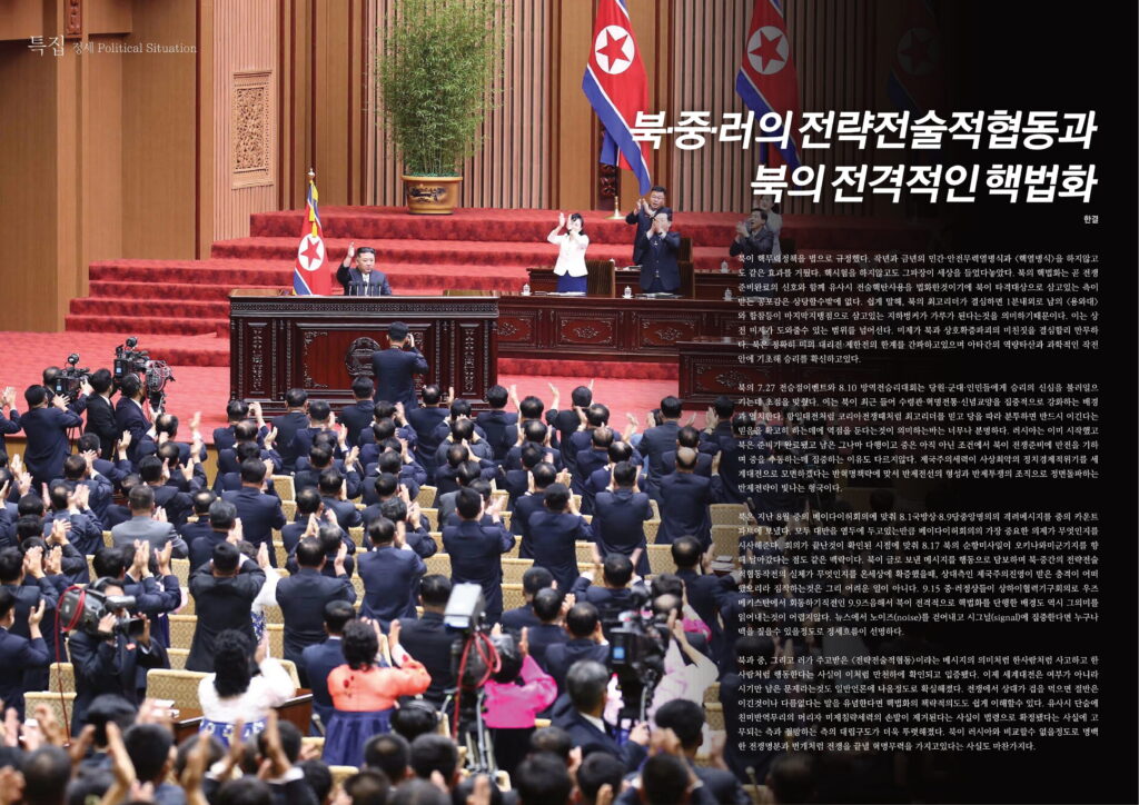 북과 중, 그리고 러가 주고받은 <전략전술적협동>이라는 메시지의 의미처럼 한사람처럼 사고하고 한사람처럼 행동한다는 사실이 이처럼 만천하에 확인되고 입증됐다. 이제 세계대전은 여부가 아니라 시기만 남은 문제라는것도 일반언론에 나올정도로 확실해졌다. 전쟁에서 상대가 겁을 먹으면 절반은 이긴것이나 다름없다는 말을 유념한다면 핵법화의 책략적의도도 쉽게 이해할수 있다. 유사시 단숨에 친미반역무리의 머리자 미제침략세력의 손발이 제거된다는 사실이 법령으로 확정됐다는 사실에 고무되는 측과 절망하는 측의 대립구도가 더욱 뚜렷해졌다. 북이 러시아와 비교할수 없을정도로 명백한 전쟁명분과 번개처럼 전쟁을 끝낼 혁명무력을 가지고있다는 사실도 마찬가지다.