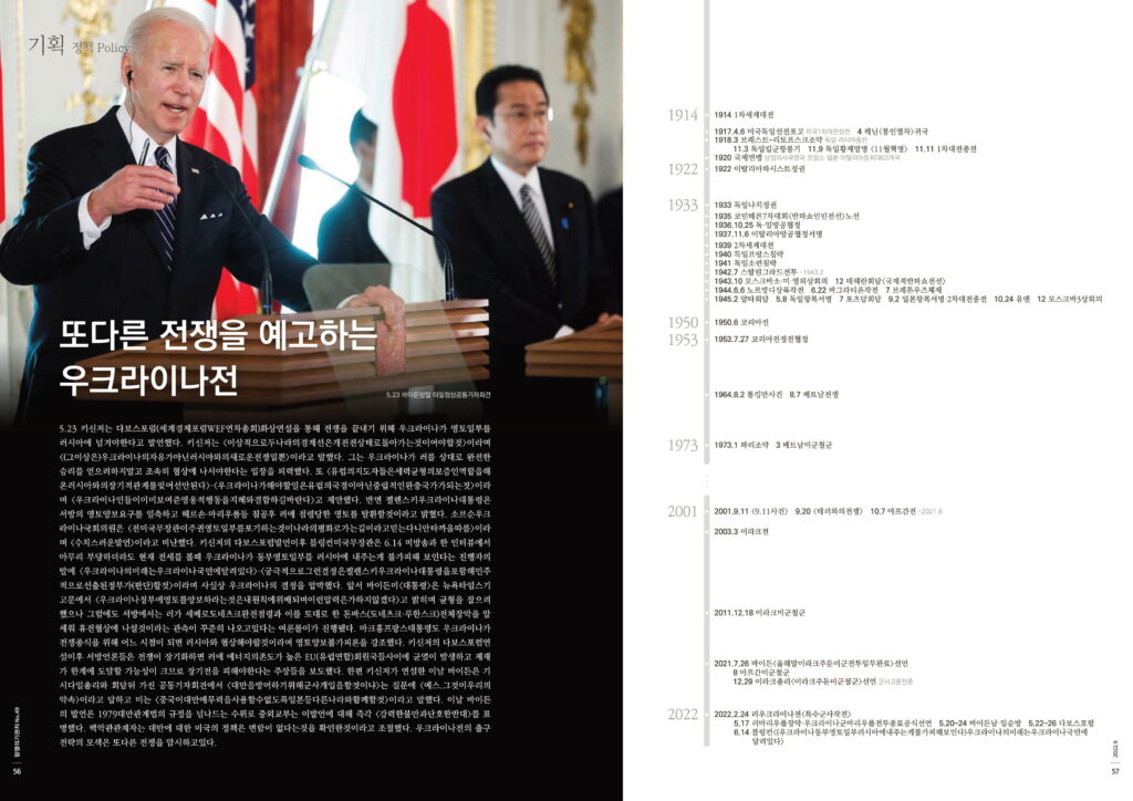 5.23 키신저는 다보스포럼(세계경제포럼WEF연차총회)화상연설을 통해 전쟁을 끝내기 위해 우크라이나가 영토일부를 러시아에 넘겨야한다고 발언했다. 키신저는 <이상적으로두나라의경계선은개전전상태로돌아가는것이어야할것>이라며 <(그이상은)우크라이나의자유가아닌러시아와의새로운전쟁일뿐>이라고 말했다. 그는 우크라이나가 러를 상대로 완전한 승리를 얻으려하지말고 조속히 협상에 나서야한다는 입장을 피력했다. 또 <유럽의지도자들은세력균형의보증인역할을해온러시아와의장기적관계를잊어선안된다>·<우크라이나가해야할일은유럽의국경이아닌중립적인완충국가가되는것>이라며 <우크라이나인들이이미보여준영웅적행동을지혜와결합하길바란다>고 제안했다. 반면 젤렌스키우크라이나대통령은 서방의 영토양보요구를 일축하고 헤르손·마리우폴등 침공후 러에 점령당한 영토를 탈환할것이라고 밝혔다. 소브순우크라이나국회의원은 <전미국무장관이주권영토일부를포기하는것이나라의평화로가는길이라고믿는다니안타까울따름>이라며 <수치스러운발언>이라고 비난했다. 키신저의 다보스포럼발언이후 블링컨미국무장관은 6.14 미방송과 한 인터뷰에서 아무리 부당하더라도 현재 전세를 볼때 우크라이나가 동부영토일부를 러시아에 내주는게 불가피해 보인다는 진행자의 말에 <우크라이나의미래는우크라이나국민에달려있다>·<궁극적으로그런결정은젤렌스키우크라이나대통령을포함해민주적으로선출된정부가(판단)할것>이라며 사실상 우크라이나의 결정을 압박했다. 앞서 바이든미<대통령>은 뉴욕타임스기고문에서 <우크라이나정부에영토를양보하라는것은내원칙에위배되며이런압력은가하지않겠다>고 밝히며 균형을 잡으려했으나 그럼에도 서방에서는 러가 세베로도네츠크완전점령과 이를 토대로 한 돈바스(도네츠크·루한스크)전체장악을 앞세워 휴전협상에 나설것이라는 관측이 꾸준히 나오고있다는 여론몰이가 진행됐다. 마크홍프랑스대통령도 우크라이나가 전쟁종식을 위해 어느 시점이 되면 러시아와 협상해야할것이라며 영토양보불가피론을 강조했다. 키신저의 다보스포럼연설이후 서방언론들은 전쟁이 장기화하면 러에 에너지의존도가 높은 EU(유럽연합)회원국들사이에 균열이 발생하고 제재가 한계에 도달할 가능성이 크므로 장기전을 피해야한다는 주장들을 보도했다. 한편 키신저가 연설한 이날 바이든은 기시다일총리와 회담뒤 가진 공동기자회견에서 <대만을방어하기위해군사개입을할것이냐>는 질문에 <예스.그것이우리의약속>이라고 답하고 미는 <중국이대만에무력을사용할수없도록일본등다른나라와함께할것>이라고 말했다. 이날 바이든의 발언은 1979대만관계법의 규정을 넘나드는 수위로 중외교부는 이발언에 대해 즉각 <강력한불만과단호한반대>를 표명했다. 백악관관계자는 대만에 대한 미국의 정책은 변함이 없다는것을 확인한것이라고 조절했다. 우크라이나전의 출구전략의 모색은 또다른 전쟁을 암시하고있다.