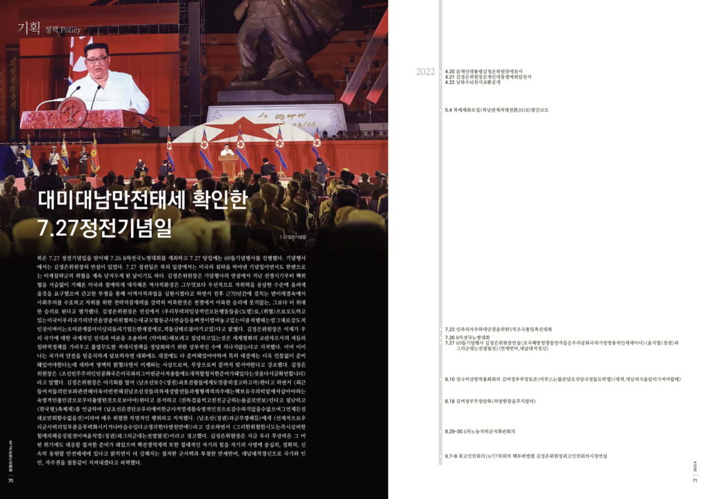 북은 7.27 정전기념일을 맞이해 7.26 8차전국노병대회를 개최하고 7.27 당일에는 69돌기념행사를 진행했다. 기념행사에서는 김정은위원장의 연설이 있었다. 7.27 정전일은 북의 입장에서는 미국의 침략을 막아낸 기념일이면서도 한편으로는 미제침략군의 위협을 계속 남겨두게 된 날이기도 하다. 김정은위원장은 기념행사의 연설에서 지난 전쟁시기부터 핵위협을 서슴없이 가해온 미국과 첨예하게 대치해온 역사적환경은 그무엇보다 우선적으로 자위력을 응당한 수준에 올려세울것을 요구했으며 간고한 투쟁을 통해 이역사적과업을 실현시켰다고 하면서 전후 근70년간에 걸치는 반미대결속에서 사회주의를 수호하고 자위를 위한 전략적잠재력을 강력히 비축한것은 전쟁에서 이룩한 승리에 못지않는, 그보다 더 위대한 승리로 된다고 평가했다. 김정은위원장은 연설에서 <우리무력의일상적인모든행동들을<도발>로,<위협>으로오도하고있는미국이우리국가의안전을엄중히위협하는대규모합동군사연습들을뻐젓이벌여놓고있는이중적행태는말그대로강도적인것이며이는조미관계를더이상되돌리기힘든한계점에로,격돌상태로몰아가고있>다고 밝혔다. 김정은위원장은 미제가 우리 국가에 대한 국제적인 인식과 여론을 조종하여 <악마화>해보려고 집념하고있는것은 세계평화의 교란자로서의 저들의 침략적정체를 가리우고 불법무도한 적대시정책을 정당화하기 위한 상투적인 수에 지나지않는다고 지적했다. 이어 이미 나는 국가의 안전을 믿음직하게 담보하자면 대화에도 대결에도 다 준비돼있어야하며 특히 대결에는 더욱 빈틈없이 준비돼있어야한다는데 대하여 명백히 밝혔다면서 미제와는 사상으로써, 무장으로써 끝까지 맞서야한다고 강조했다. 김정은위원장은 <조선민주주의인민공화국은미국과의그어떤군사적충돌에도대처할철저한준비가돼있다는것을다시금확언합니다>라고 말했다. 김정은위원장은 이기회를 빌어 <남조선보수<정권>과호전광들에게도엄중히경고하고자>한다고 하면서 <최근들어저들의안보와관련해더욱더빈번해진남조선것들의허세성발언들과형형색색의추태는핵보유국의턱밑에서살아야하는숙명적인불안감으로부터출발한것으로보아야>한다고 분석하고 <잔뜩겁을먹고전전긍긍하는몰골로만보>인다고 힐난하고 <한국형3축체계>를 언급하며 <남조선은결단코우리에비한군사적열세를숙명적인것으로감수하지않을수없으며그언제든절대로만회할수없을것>이라며 매우 위험한 자멸적인 행위라고 지적했다. <남조선<정권>과군부깡패들>에게 <선제적으로우리군사력의일부분을무력화시키거나마슬수있다고생각한다면천만에!>라고 강조하면서 <그러한위험한시도는즉시강력한힘에의해응징될것이며윤석열<정권>과그의군대는전멸될것>이라고 경고했다. 김정은위원장은 지금 우리 무장력은 그 어떤 위기에도 대응할 철저한 준비가 돼있으며 핵전쟁억제력 또한 절대적인 자기의 힘을 자기의 사명에 충실히, 정확히, 신속히 동원할 만전태세에 있다고 밝히면서 더 강해지는 철저한 군사력과 투철한 반제반미, 대남대적정신으로 국가와 인민, 자주권을 철통같이 지켜내겠다고 피력했다.