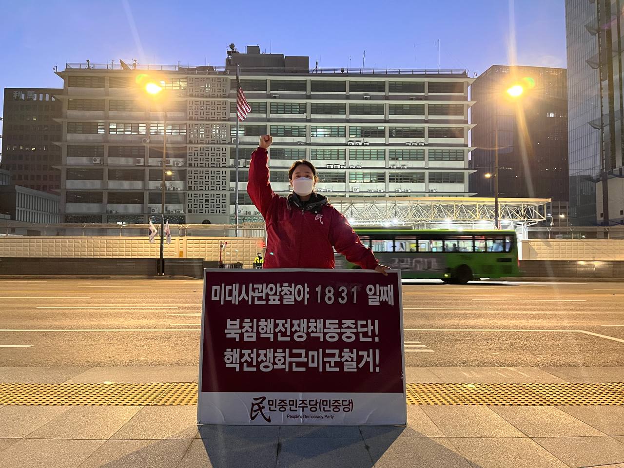 1일 민중민주당(민중당)은 미대사관앞에서 <선제타격망발 윤석열무리청산! 북침핵전쟁책동중단! 핵전쟁화근 미군철거!> 구호를 들고 평화시위를 2265일째 전개했다.