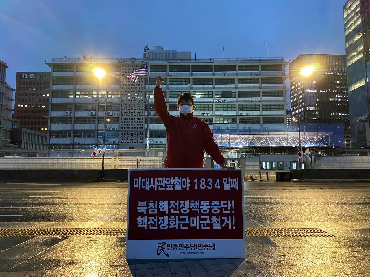 4일 민중민주당(민중당)은 미대사관앞에서 <선제타격망발 윤석열무리청산! 북침핵전쟁책동중단! 핵전쟁화근 미군철거!> 구호를 들고 평화시위를 2268일째 전개했다.