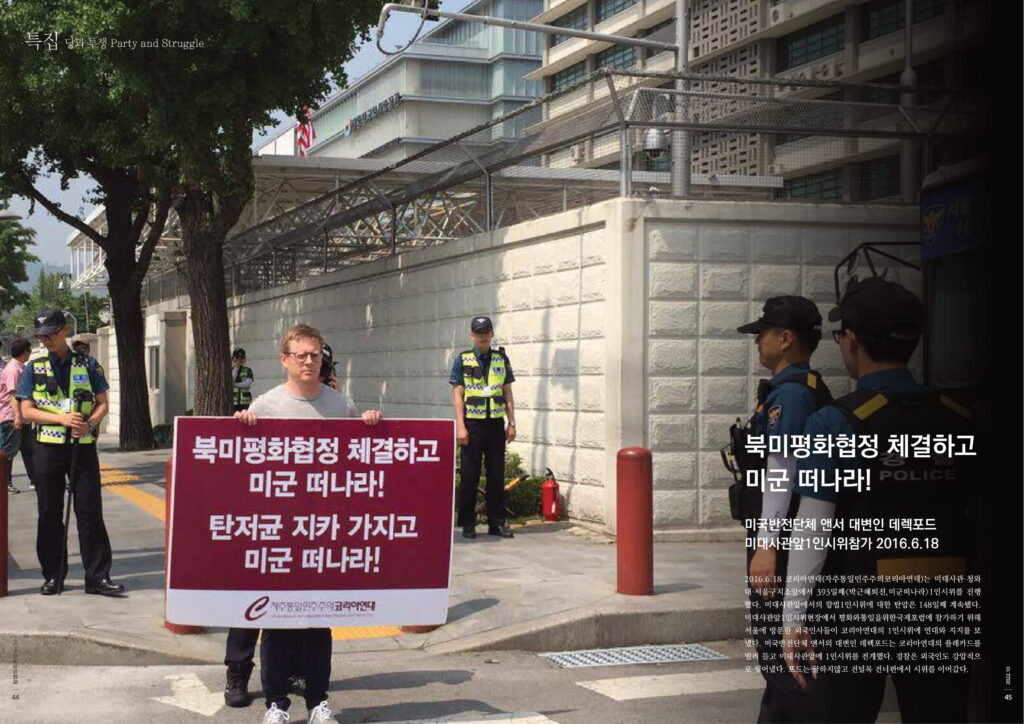 2016.6.18 코리아연대(자주통일민주주의코리아연대)는 미대사관·청와대·서울구치소앞에서 393일째<박근혜퇴진,미군떠나라>1인시위를 진행했다. 미대사관앞에서의 합법1인시위에 대한 탄압은 148일째 계속됐다. 미대사관앞1인시위현장에서 평화와통일을위한국제포럼에 참가하기 위해 서울에 방문한 외국인사들이 코리아연대의 1인시위에 연대와 지지를 보냈다. 미국반전단체 앤서의 대변인 데렉포드는 코리아연대의 플래카드를 빌려 들고 미대사관앞에 1인시위를 전개했다. 경찰은 외국인도 강압적으로 밀어냈다. 포드는 굴하지않고 건널목 건너편에서 시위를 이어갔다.