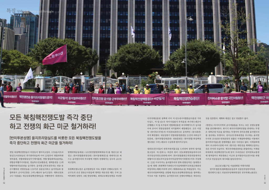 <한반도>·아시아지역의 군사적충돌을 부르는 모든 전쟁도발행위를 중단해야한다. 현시기 제국주의침략전쟁을 반대하는 투쟁은 침략군대 미군을 철거하는 투쟁이며 친미호전광 윤석열무리를 청산하는 투쟁이다. 친미호전·반북대결을 추구하는 윤석열무리와 조국분단·민족분열의 원흉인 미제침략세력을 이땅에서 쓸어버리지않는한 전쟁위협은 결코 사라질수 없다. 미제침략세력이 우크라이나전에 이어 <한국전>·대만전을 획책하고있다는것은 주지의 사실이다. 제국주의패권전략을 관철하려는 미제침략세력의 북침핵전쟁기도에 맞서 우리민중은 반미반파쇼항쟁에 떨쳐일어나 핵전쟁화근 미군과 윤석열친미호전무리를 파멸시키고 민중중심의 새시대를 앞당길것이다.
