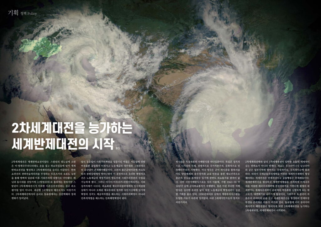 2차세계대전때와 달리 3차세계대전이 임박한 오늘의 세계적이슈는 반파쇼가 아니라 반제다. 파쇼는 우크라이나나 남코리아와 같은 일부지역에 벌어지는 국내적이슈, 국지적이슈에 불과하다. 따라서 국제공동주의세력을 비롯한 세계자주세력이 형성해야하는 세계전선은 반제전선이고 공동행동은 반제행동이다. 세계반제전선을 형성하고 세계반제행동을 전개하며 미제국주의를 비롯한 제국주의세력에 결정적타격을 가한다면 현재의 대격변기는 세계자주세력이 온세계의 자주화를 실현하게 되는 대고조기, 대변혁기로 나아가게 될것이다. 사회주의 북·중국이 자본주의 러시아와 손을 잡고 세계반제전선을 형성하며 반제무장투쟁을 준비해온 이유가 여기에 있다. 동유럽에 이어 동아시아에서까지 해방전쟁이 벌어지게 되면 2차세계대전을 능가하는 3차세계대전, 세계반제대전이 시작된다.