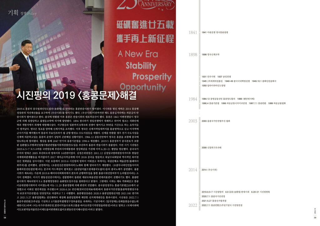 2019.6 홍콩의 중국범죄인인도법안<송환법>을 반대하는 홍콩반중시위가 벌어졌다. 이시위를 벌인 세력은 2014 홍콩행정장관의 직선제선출을 요구하며 <우산시위>를 벌이기도 했다. <우산시위>이전까지만 해도 홍콩길거리에는 파룬궁의 반중시위가 벌어졌다고 한다. 중국에 반환된 이후 홍콩은 반중시위의 대표적공간이 됐다. 홍콩은 1841 아편전쟁당시 영국군에 의해 점령당하고 불평등조약에 의거해 할양됐다. 1894 청나라가 청일전쟁에서 대패하고 뒤이어 청조는 의화단세력과 개항지에서 외세에 대항해나섰다. 서구열강과 일본까지 8개국과 전쟁이 벌어지고 99년을 기간으로 하는 조차지들이 생겨났다. 영국은 청조를 압박해 신계지역을 조차했다. 이후 영국은 신계지역일대까지를 홍콩영역으로 삼고 이지역에 군사기지를 배치했으며 홍콩의 주요인프라가 될 공항·발전소·수도시설등을 세웠다. 신계를 반환할 경우 전기·수도시설을 신계에 의존하고있는 홍콩의 운영이 상당히 곤란해질 상황이었다. 1984.12 공동선언에서 영국은 홍콩을 포함해 중국에 양도하는데 합의했다. 협상을 통해 2047 만기의 홍콩기본법을 1990.4 제정했다. 2019.5 홍콩정부가 중국본토가 포함된 송환법(도주범죄인및형사법관련법률지원개정법안)도입을 추진하자 홍콩의 반중시위가 불붙었다. 이런 시기 시진핑은 2019.6.5~7 모스크바를 국빈방문해 푸틴러시아대통령과 정상회담을 가진데 이어 6.20~21 평양을 방문했다. 중국국가주석의 방북은 2005 후진타오의 방북이후 14년만이었다. 김정은위원장은 2011.12 김정일국방위원장서거이후 한동안 국제대외관계활동을 하지않다가 2017 대미군사적공세에 이어 2018 중국을 방문하고 북남수뇌회담과 역사적인 북미정상간 첫회담을 성사시켰다. 이런 흐름에서 2019.6 시진핑의 방북이 이뤄졌고 북에서는 대집단체조·예술공연<불패의사회주의>를 준비했다. 공연에서는 <조중친선은영원하리라>노래와 함께 양국국기가 게양됐다. <조중두나라인민들사이의불패의친선단결만세>라는 문구의 카드섹션이 펼쳐졌고 <공산당이없으면새중국도없다>등의 중국노래가 공연됐다. 홍콩시위가 계속되는 가운데 2019.8 베이다이허회의에서 본토의 군병력투입을 통한 홍콩시위진압여부가 논의될것이라는 소식이 전해졌다. 이시기 광둥성선전시에서는 경찰병력이 동원된 대규모폭동진압·반테러훈련이 진행되기도 했다. 홍콩반중시위가 계속되면서 9.4 홍콩행정장관은 송환법도입추진을 철회한다고 밝혔다. 그럼에도 시위는 계속 격화돼갔고 홍콩이공대점령시위까지 이어졌는데 이는 11.29 홍콩경찰에 의해 완전히 진압됐다. 중국중앙정부는 홍콩기본법23조에서 규정했으나 미뤄진 법안제정을 추진했으며 2020.6.30 전인대(전국인민대표대회)에서 홍콩국가안전법(홍콩특별행정구유지·보호국가안전법)을 만장일치로 의결하고 7.1 시행했다. 홍콩행정장관은 2020.9 홍콩입법원선거를 2021.9로 연기하고 2021.5.27 홍콩입법회는 전인대에서 제정해 홍콩입법회에 제안한 선거제개편안을 통과시켰다. 시진핑은 2022.7.1 홍콩주권반환25주년을 기념하고 6기홍콩특별행정구정부출범을 축하하는 기념식에서 <일국양제는전례를찾을수없는위대한시도>라며 <이는국가주권과안전,발전이익을수호하고홍콩·마카오의장기적번영을위한것>이라고 말하고 <국제사회에서도보편적동의를얻은이제도를어떤변화도없이오랫동안견지해나갈것>이라고 밝혔다.