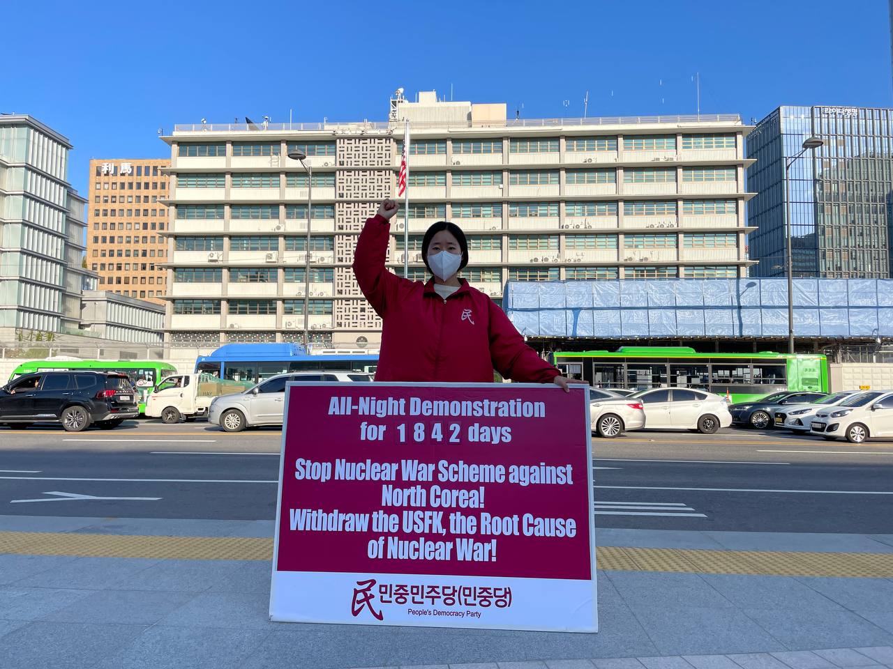 12일 민중민주당(민중당)은 미대사관앞에서 <선제타격망발 윤석열무리청산! 북침핵전쟁책동중단! 핵전쟁화근 미군철거!> 구호를 들고 평화시위를 2276일째 전개했다.