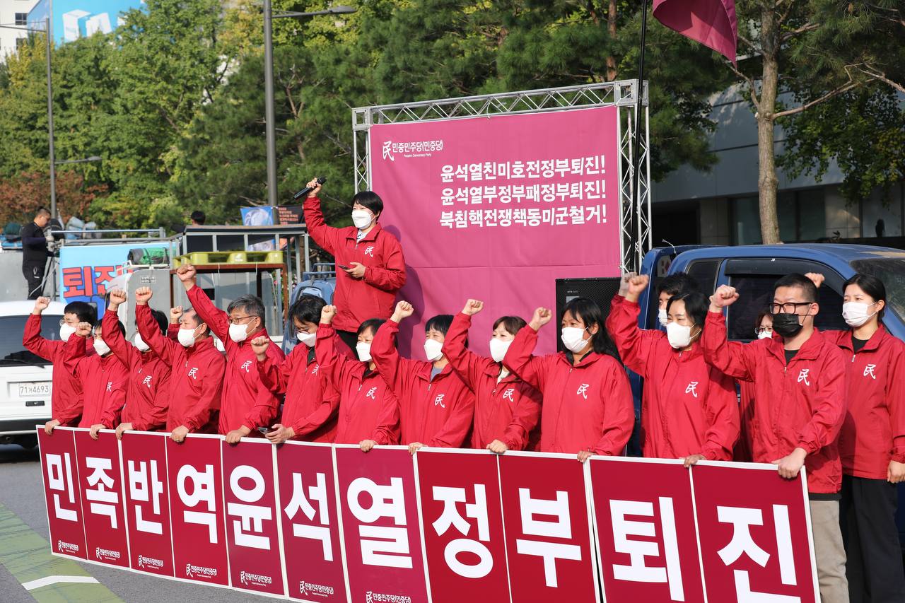 22일 민중민주당(민중당)은 <김건희 특검·윤석열 퇴진을 위한 전국집중 촛불대행진>이 열리는 시청역7번출구인근에서 <윤석열친미호전정부퇴진! 윤석열부정부패정부퇴진! 북침핵전쟁책동미군철거!> 트럭정당연설회를 진행했다.