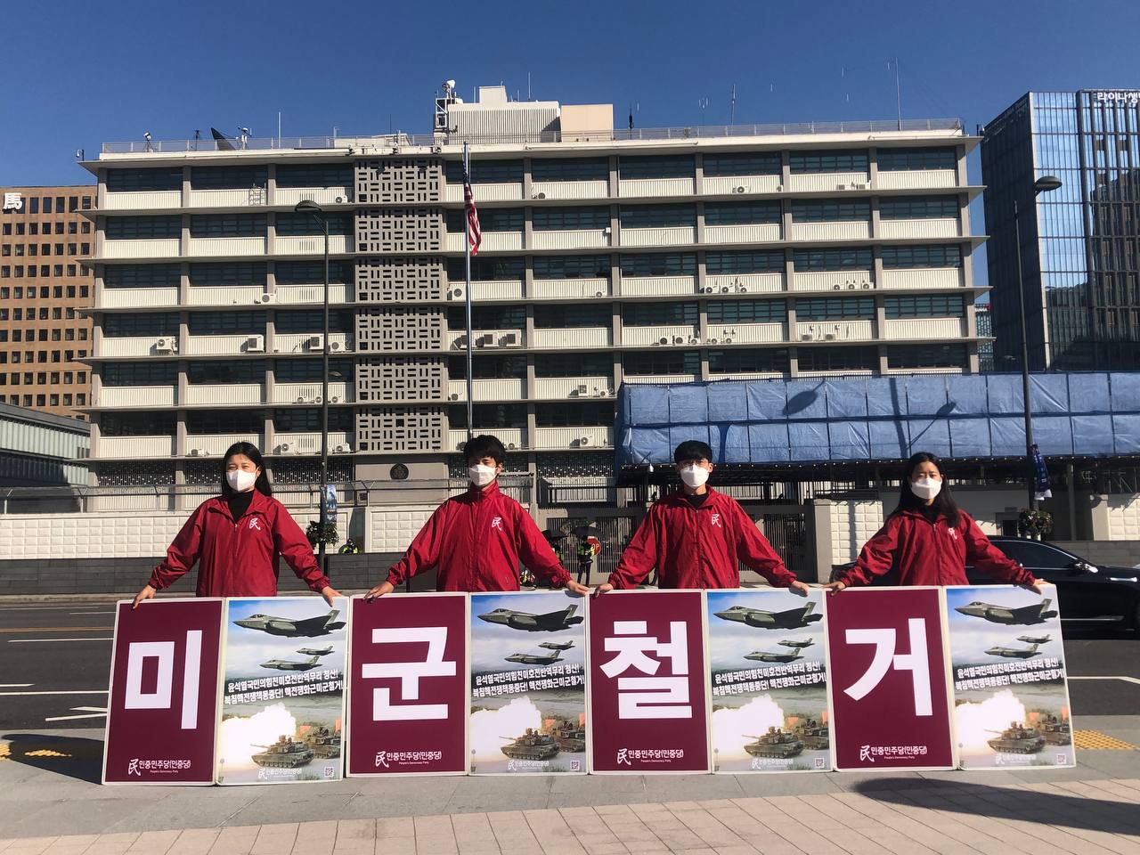 20일 민중민주당(민중당)은 미대사관앞에서 <선제타격망발 윤석열무리청산! 북침핵전쟁책동중단! 핵전쟁화근 미군철거!> 구호를 들고 평화시위를 2284일째 전개했다.