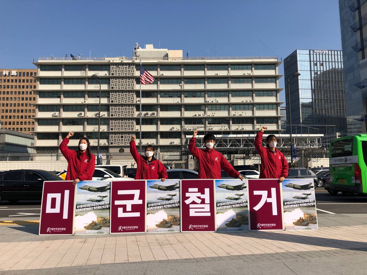 21일 민중민주당(민중당)은 미대사관앞에서 <선제타격망발 윤석열무리청산! 북침핵전쟁책동중단! 핵전쟁화근 미군철거!> 구호를 들고 평화시위를 2285일째 전개했다.