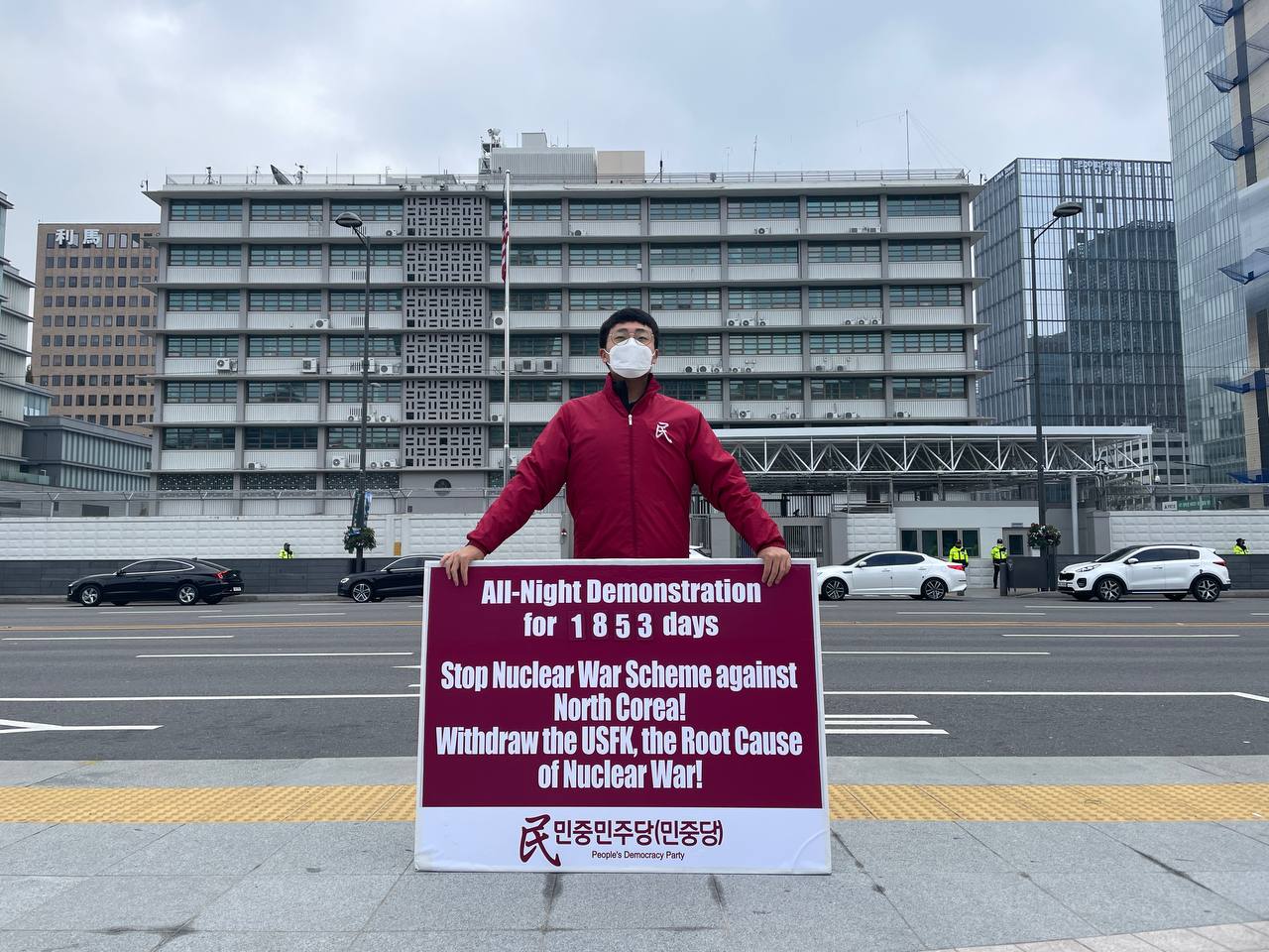 23일 민중민주당(민중당)은 미대사관앞에서 <선제타격망발 윤석열무리청산! 북침핵전쟁책동중단! 핵전쟁화근 미군철거!> 구호를 들고 평화시위를 2287일째 전개했다.