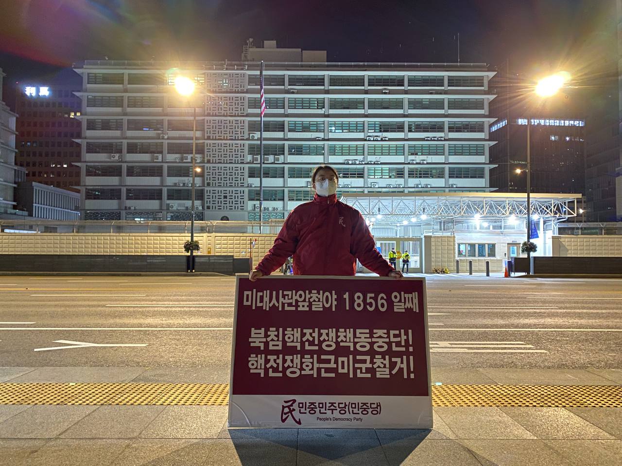 26일 민중민주당(민중당)은 미대사관앞에서 <선제타격망발 윤석열무리청산! 북침핵전쟁책동중단! 핵전쟁화근 미군철거!> 구호를 들고 평화시위를 2290일째 전개했다.