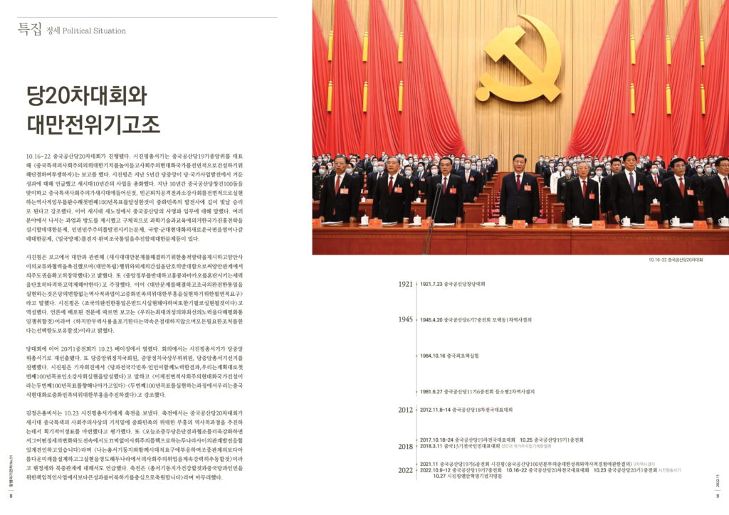 10.16~22 중국공산당20차대회가 진행됐다. 시진핑총서기는 중국공산당19기중앙위를 대표해 <중국특색의사회주의의위대한기치를높이들고사회주의현대화국가를전면적으로건설하기위해단결하여투쟁하자>는 보고를 했다. 시진핑은 지난 5년간 당중앙이 당·국가사업발전에서 거둔 성과에 대해 언급했고 새시대10년간의 사업을 총화했다. 지난 10년간 중국공산당창건100돌을 맞이하고 중국특색사회주의가새시대에들어선것, 빈곤퇴치공격전과소강사회를전면적으로실현하는역사적임무를완수해첫번째100년목표를달성한것이 중화민족의 발전사에 길이 빛날 승리로 된다고 강조했다. 이어 새시대 새노정에서 중국공산당의 사명과 임무에 대해 말했다. 여러분야에서 나서는 과업과 방도를 제시했고 구체적으로 과학기술과교육에의거한국가진흥전략을실시할데대한문제, 인민민주주의를발전시키는문제, 국방·군대현대화의새로운국면을열어나갈데대한문제, <일국양제>를견지·완비조국통일을추진할데대한문제등이 있다.
