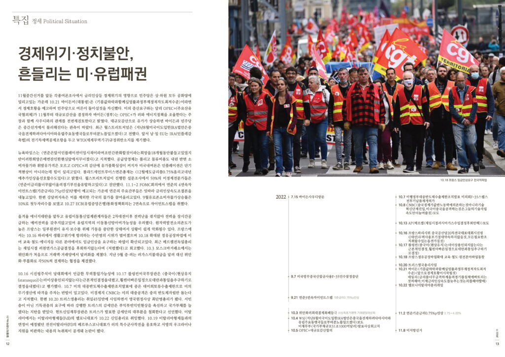 10.16 시진핑주석이 당대회에서 언급한 무력통일가능성에 10.17 블링컨미국무장관은 <중국이<현상유지(statusquo)>는더이상용인되지않는다는근본적인결정을내렸고,훨씬더빠른일정으로대만과통일을추구하기로결정을내렸다>고 평가했다. 10.7 미의 대중반도체수출제한조치발표에 중은 대미희토류수출제한으로 미의 무기생산에 타격을 주자는 반발이 일고있다. 미경제지 CNBC는 미의 대중공격은 중의 반도체자립만 돕는다고 지적했다. 한편 10.20 트러스영총리는 취임45일만에 사임하면서 영국헌정사상 최단명총리가 됐다. 서민층이 아닌 기득권층의 요구에 따라 강행한 트러스의 감세안은 부익부빈익빈현상을 촉진하고 국가부채를 늘렸다는 지탄을 받았다. 헌트신임재무장관은 트러스가 발표한 감세안의 대부분을 철회한다고 선언했다. 이탈리아에서는 이탈리아형제들(Fdl)의 멜로니대표가 10.22 신임총리로 취임했다. 10.19 이탈리아형제들과의 연정이 예정됐던 전진이탈리아(FI)의 베르루스코니대표가 러의 특수군사작전을 옹호하고 서방의 우크라이나지원을 비판하는 내용의 녹취록이 공개돼 논란이 됐다.