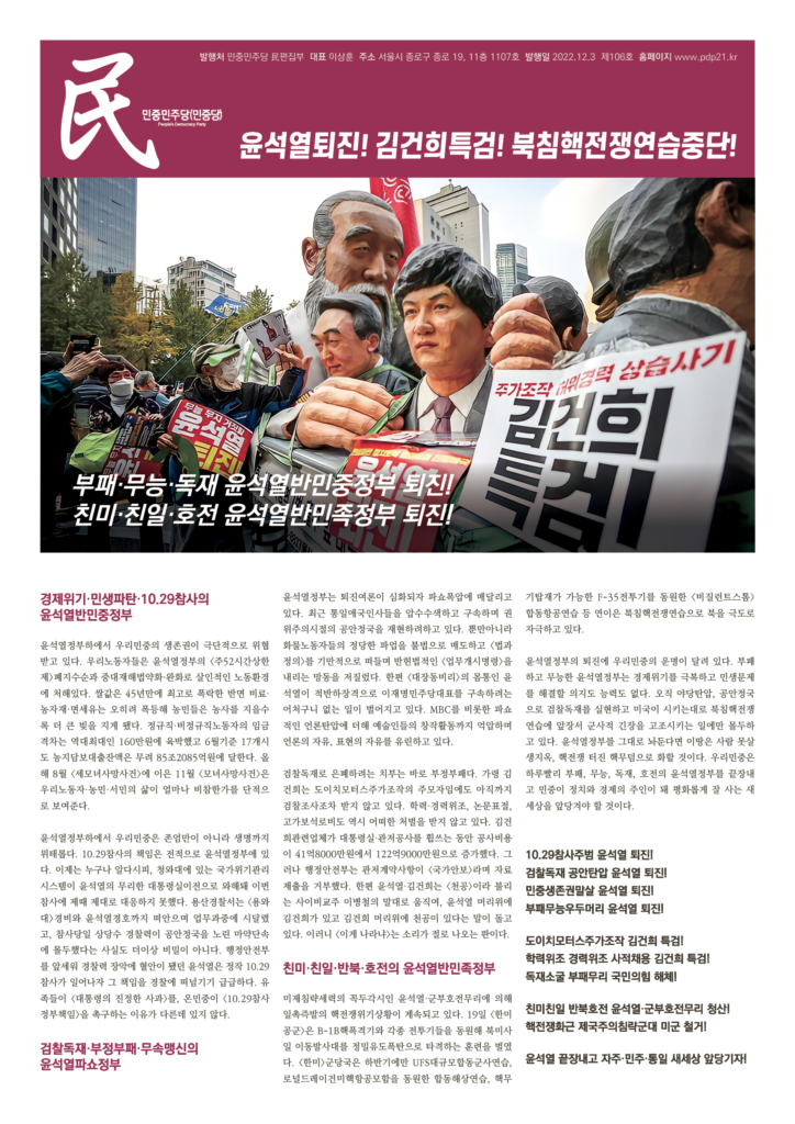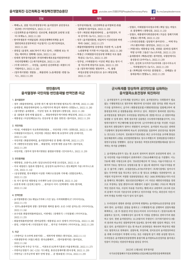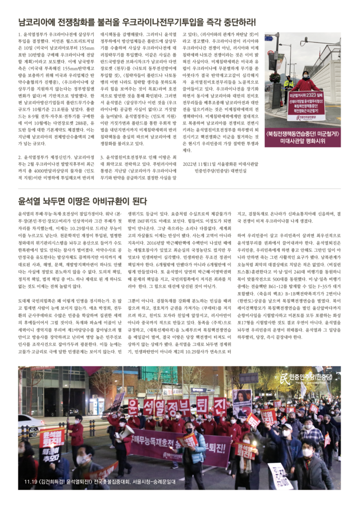3. 우리민중의 생명과 권리를 심각하게 위협하는 윤석열파쇼호전정부를 끝장내야 한다. 윤석열은 검찰을 앞세우고 <시행령통치>를 감행하며 검찰독재를 획책하고, <본·부·장(본인·부인·장모)>비리의 우두머리로서 <정권사유화>에 골몰하고 있으며, 사대매국성이 골수에 차 이땅을 전쟁터로 전락시키려 광분하고 있다. 한편 윤석열정부는 10.29참사의 주원인이 <국가위기관리시스템>의 붕괴와 파쇼적인 경찰력장악에 있음에도 참사에 대한 일말의 책임도 지지 않고 있다. 윤석열정부가 있는 한 파쇼적 공안탄압은 계속되며 학살적인 대참사도 필연적으로 반복된다. 검찰독재, 부정부패, 친미호전의 윤석열정부퇴진을 위해 우리민중이 투쟁에 나서는 것은 사람답게 살기 위한 유일한 방도다. 우리민중은 윤석열퇴진민중항쟁에 총궐기해 윤석열파쇼호전정부를 몰아내고 민중이 주인되는 민중민주세상을 앞당길 것이다.