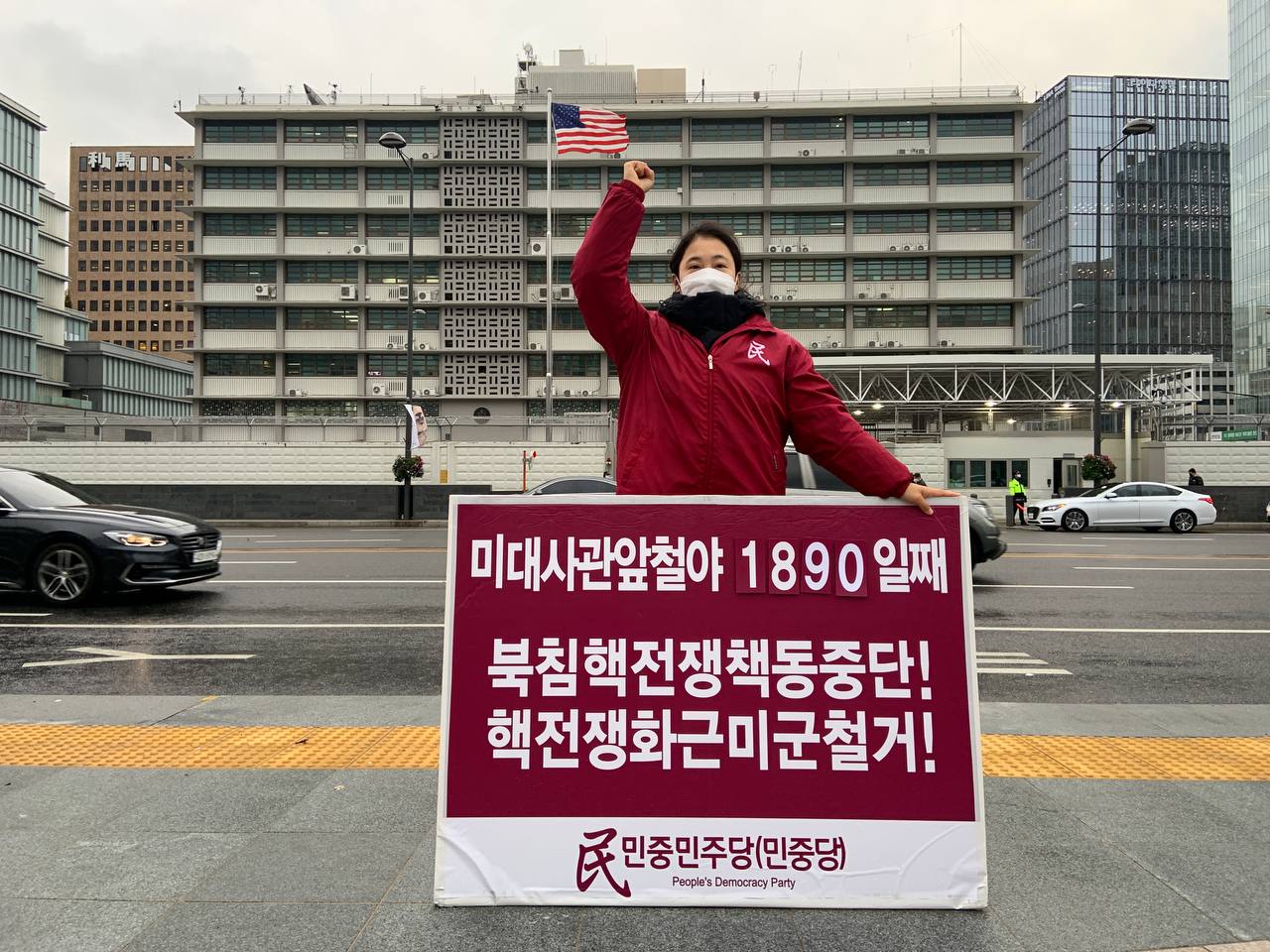 29일 민중민주당(민중당)은 미대사관앞에서 <선제타격망발 윤석열무리청산! 북침핵전쟁책동중단! 핵전쟁화근 미군철거!> 구호를 들고 평화시위를 2324일째 전개했다.