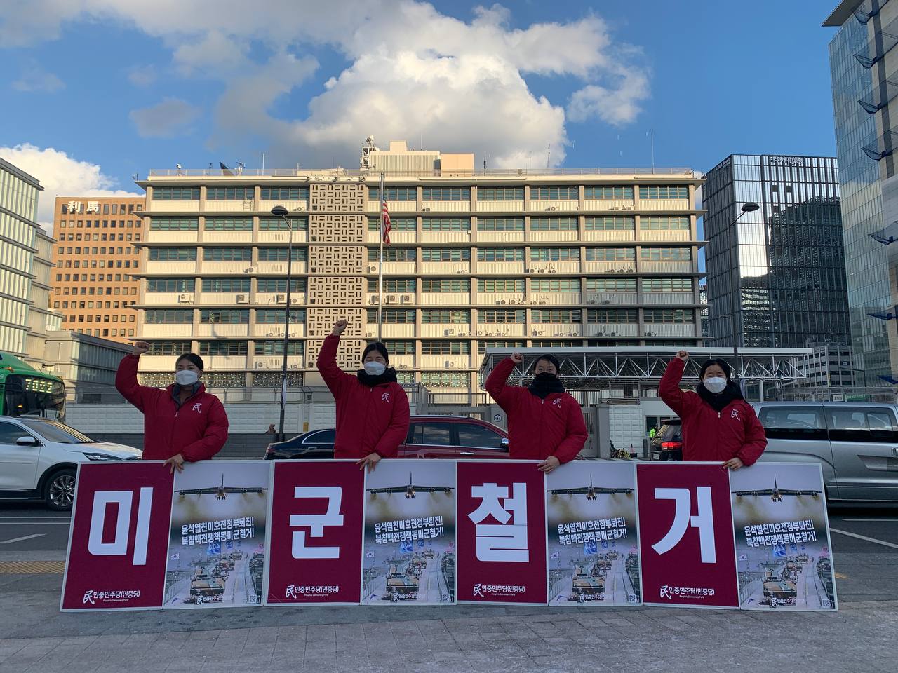 6일 민중민주당(민중당)은 미대사관앞에서 <선제타격망발 윤석열무리청산! 북침핵전쟁책동중단! 핵전쟁화근 미군철거!> 구호를 들고 평화시위를 2331일째 전개했다.