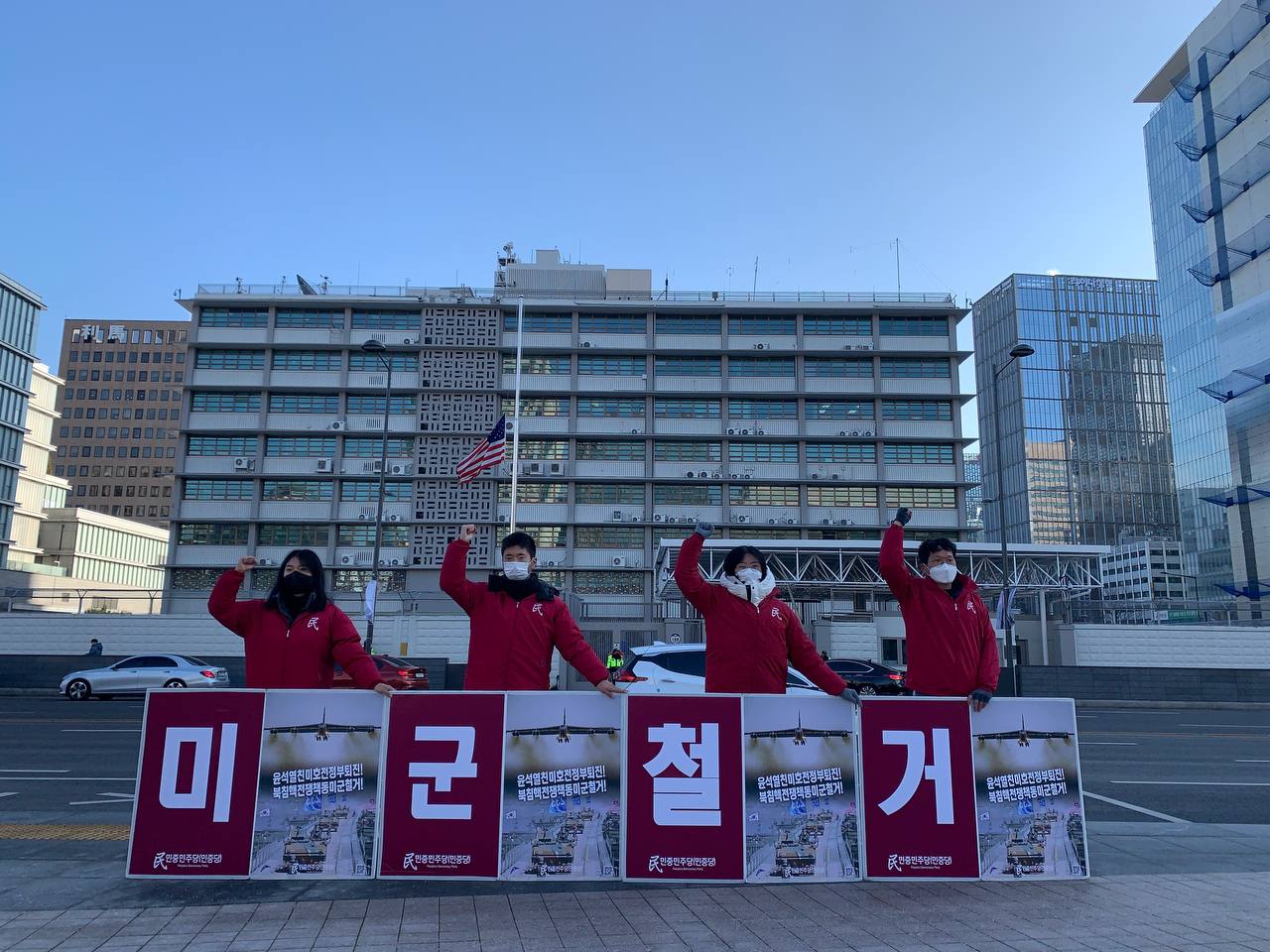 7일 민중민주당(민중당)은 미대사관앞에서 <선제타격망발 윤석열무리청산! 북침핵전쟁책동중단! 핵전쟁화근 미군철거!> 구호를 들고 평화시위를 2332일째 전개했다.